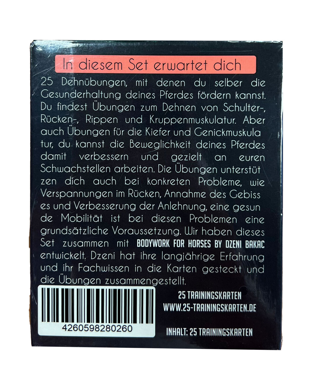 Die Karten sind ideal, um gängige Probleme wie Rückenverspannungen, Schwierigkeiten bei der Gebissannahme und Anlehnungsprobleme anzugehen. Eine verbesserte Mobilität ist für die Lösung dieser Herausforderungen essentiell. Jede Übung wurde sorgfältig zusammengestellt und basiert auf der langjährigen Erfahrung und dem Fachwissen von Dzeni Bakac von „Bodywork for Horses“.