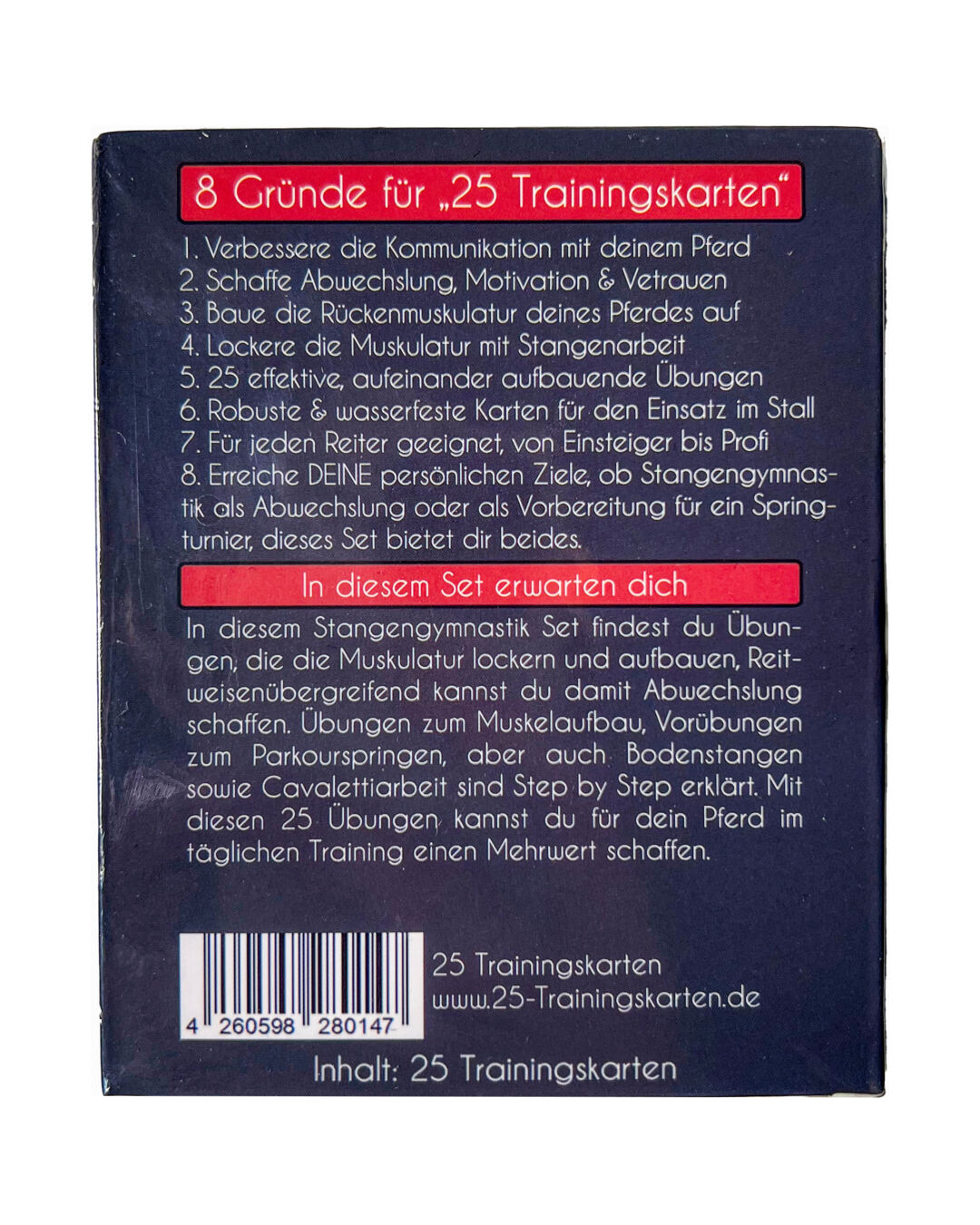 Die Stangengymnastik ist eine fantastische Ergänzung für alle Reitweisen und kann problemlos in dein tägliches Training integriert werden. Die 25 Trainingskarten bieten dir eine reiche Auswahl an Übungen, sodass du das Training individuell an die Bedürfnisse deines Pferdes anpassen kannst. Auf der Rückseite der Karten findest du immer eine vorangehende und eine weiterführende Übung.