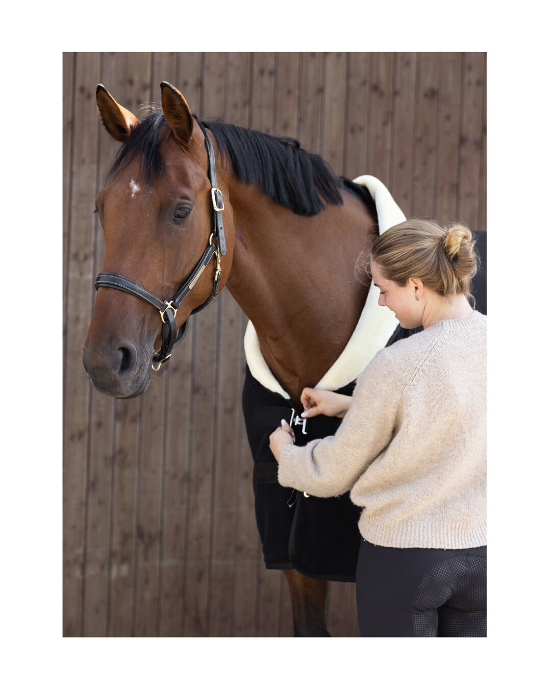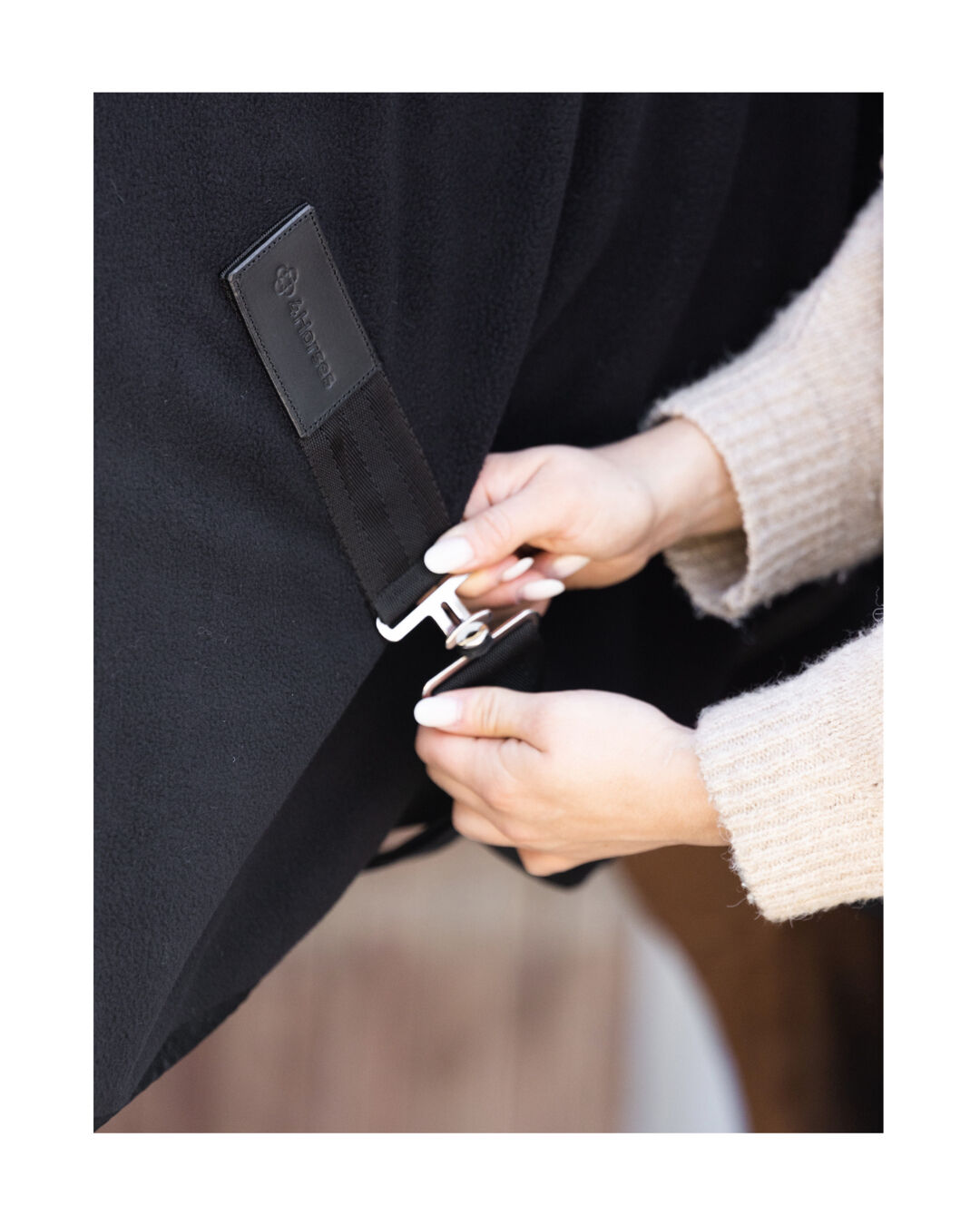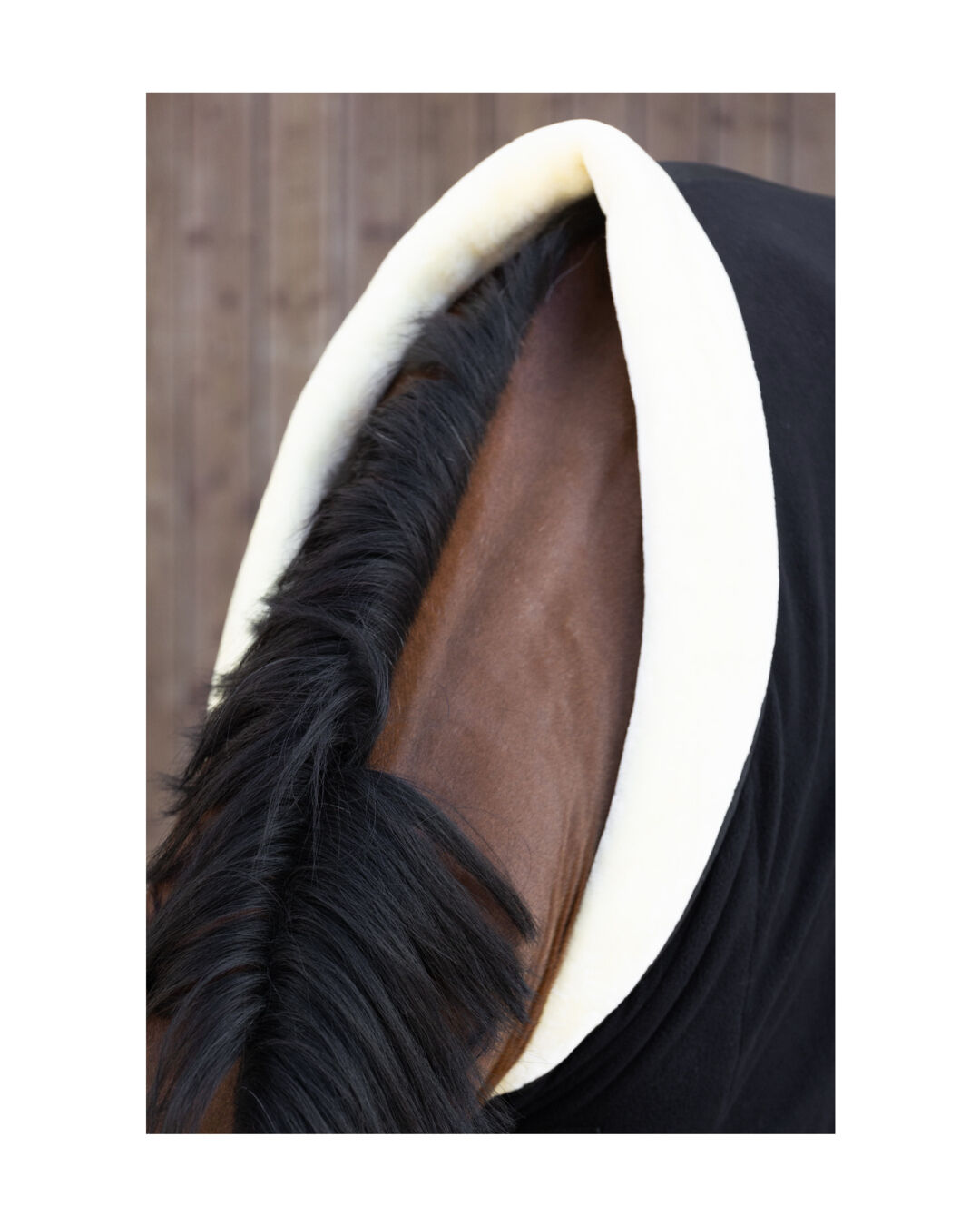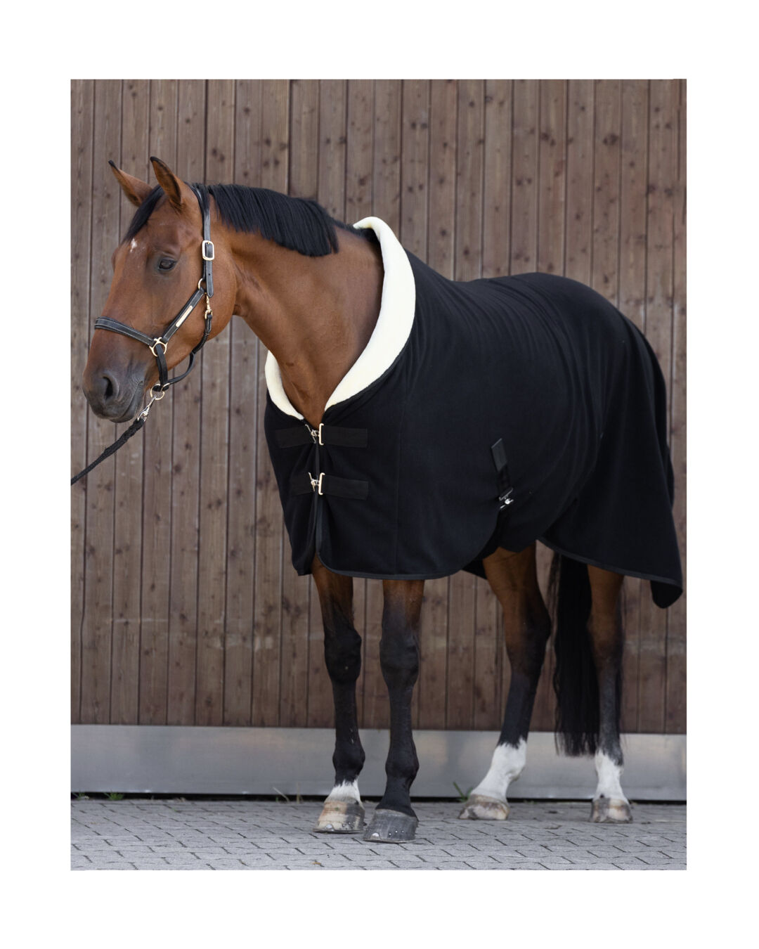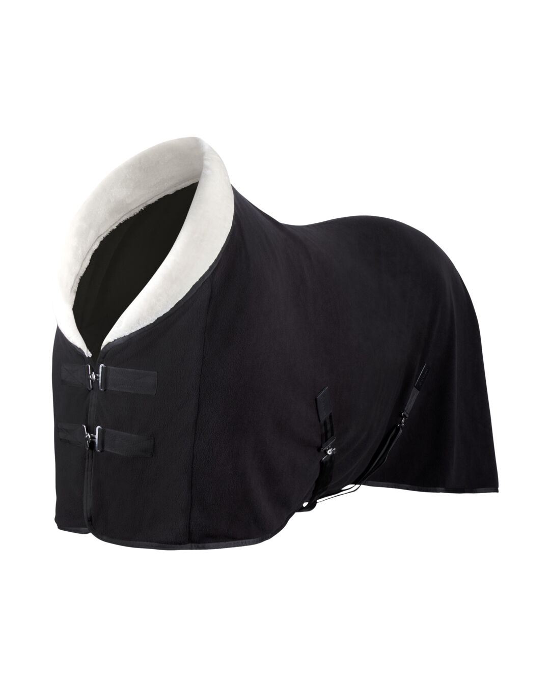 Zu einem echten Hingucker wird die Abschwitzdecke durch den prägnanten Kunstfellkragen. Das Verrutschen der Decke lässt sich durch eine Kreuzbegurtung, eine Doppelbrustverschnallung sowie den integrierten Schweifriemen verhindern.