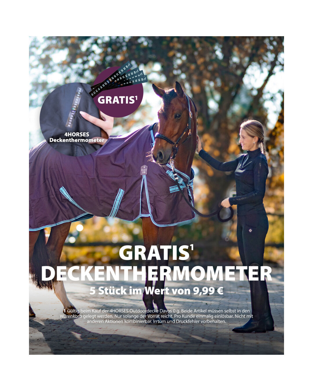 Hinweis: Aktuell erhältst du die 4HORSES Deckenthermometer beim Kauf der 4HORSES Outdoordecke Davos 0 g gratis dazu. Beide Artikel müssen dazu selbst in den Warenkorb gelegt werden. Nur solange der Vorrat reicht. Pro Kunde einmalig einlösbar. Nicht mit anderen Aktionen kombinierbar. Irrtum und Druckfehler vorbehalten.