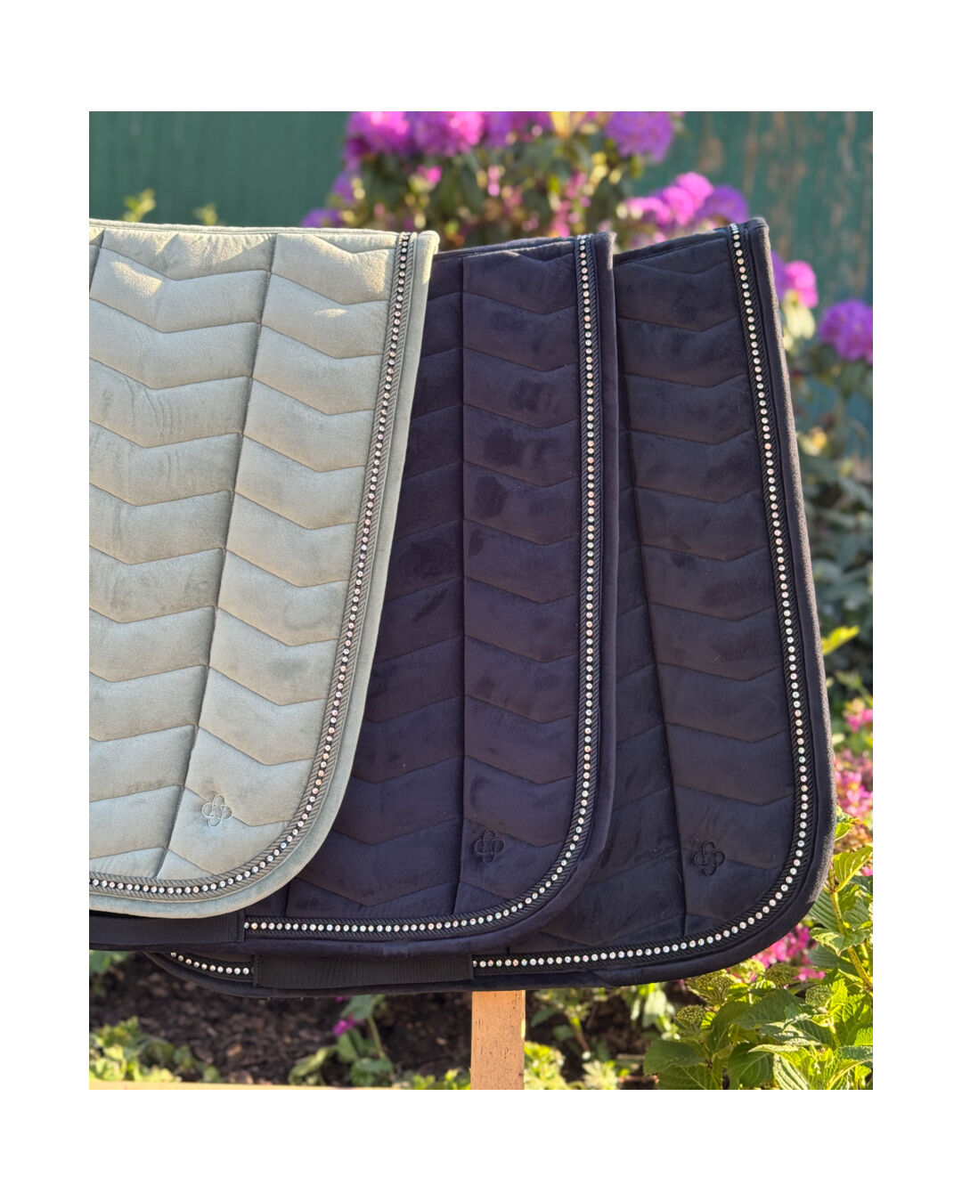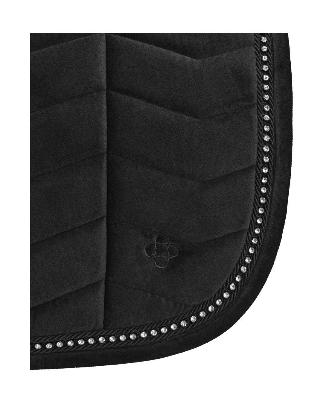 Die Dressurschabracke Leeds ist mit einer 10 mm dicken Schaumschicht und 300 g/m² Polyfill gefüttert, was für eine optimale Polsterung sorgt. Die quadratische Steppung und das Ton-in-Ton gestickte 4Horses-Logo verleihen der Schabracke eine elegante Note, die durch das eingearbeitete, doppelte Zierband und die funkelnden Kristallkettchen noch unterstrichen wird.
