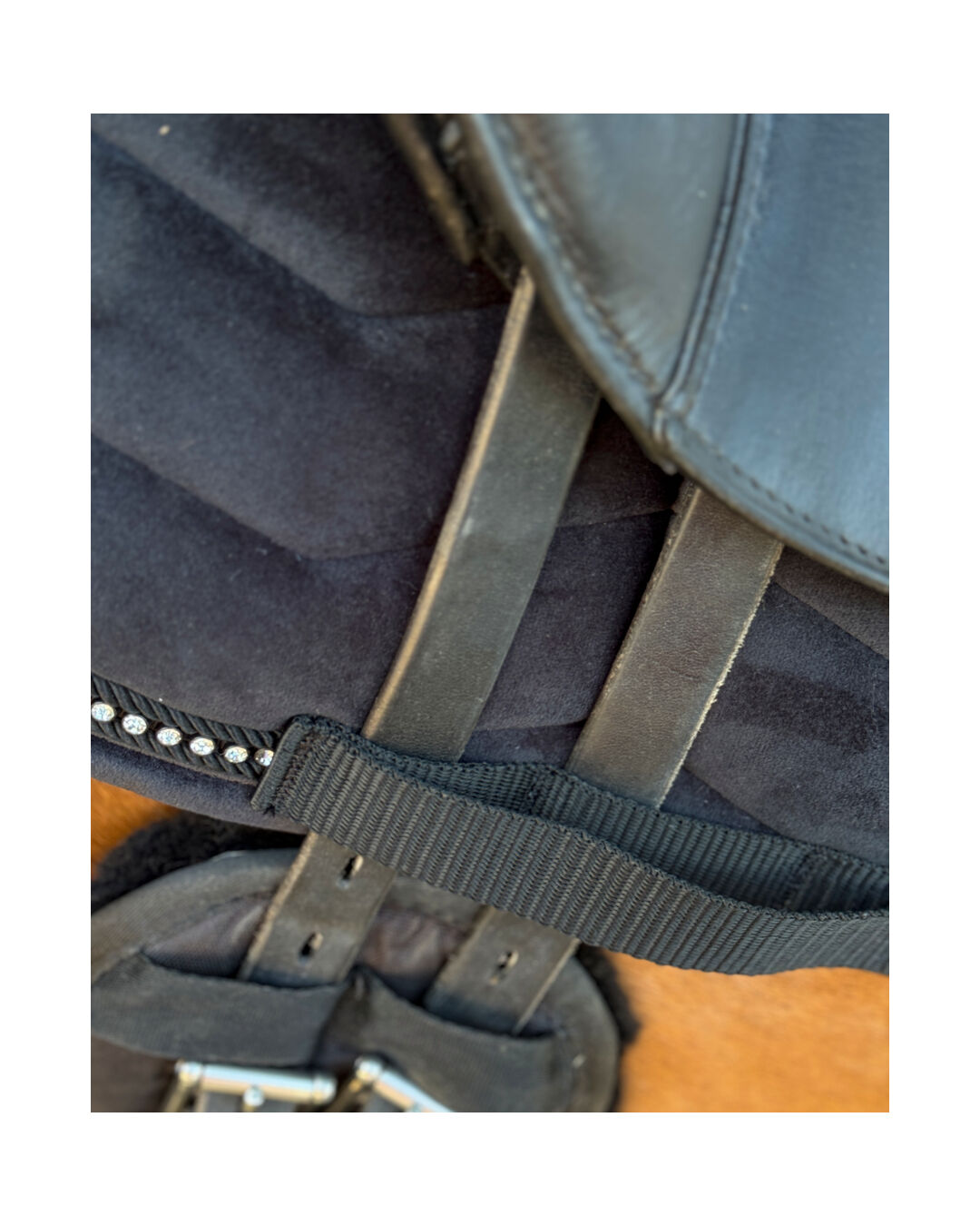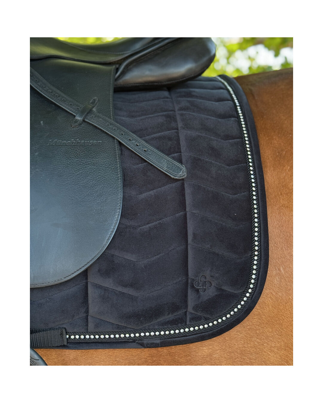 Durch die Gurt- und Strupfenschlaufen mit Klettverschluss bleibt die Schabracke sicher an ihrem Platz, während die aufwendigen Details in Design und Verarbeitung für eine langlebige und stilvolle Optik sorgen.