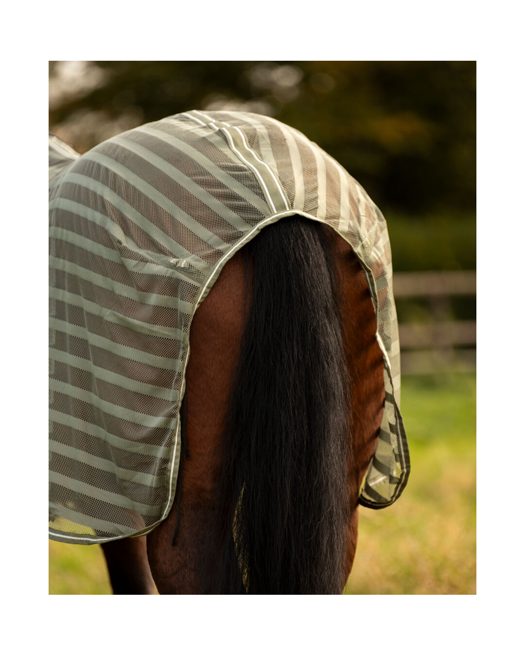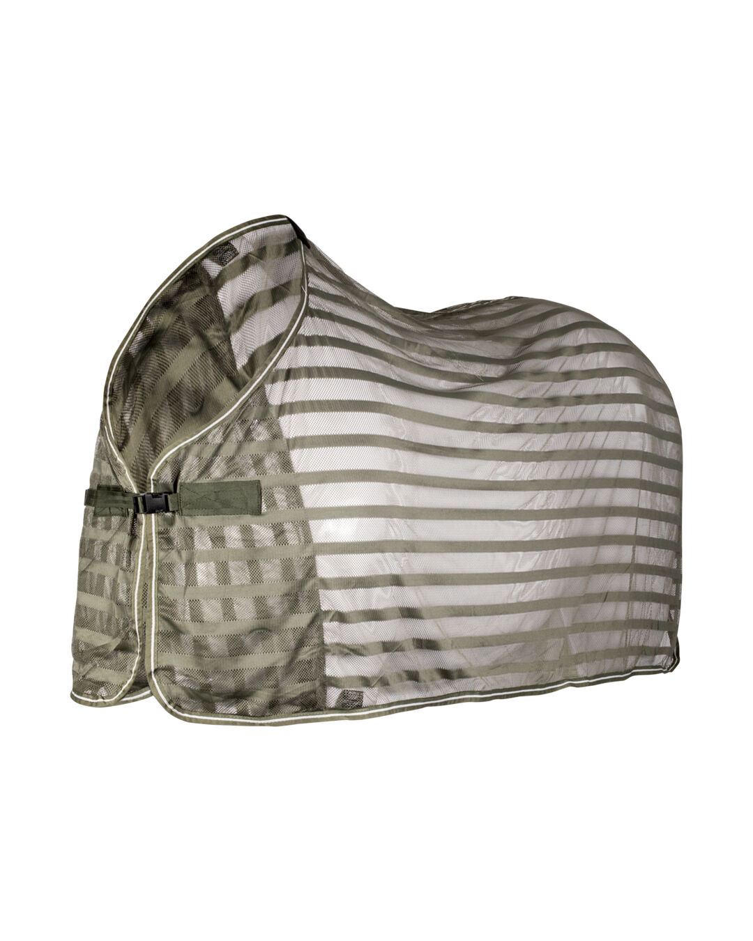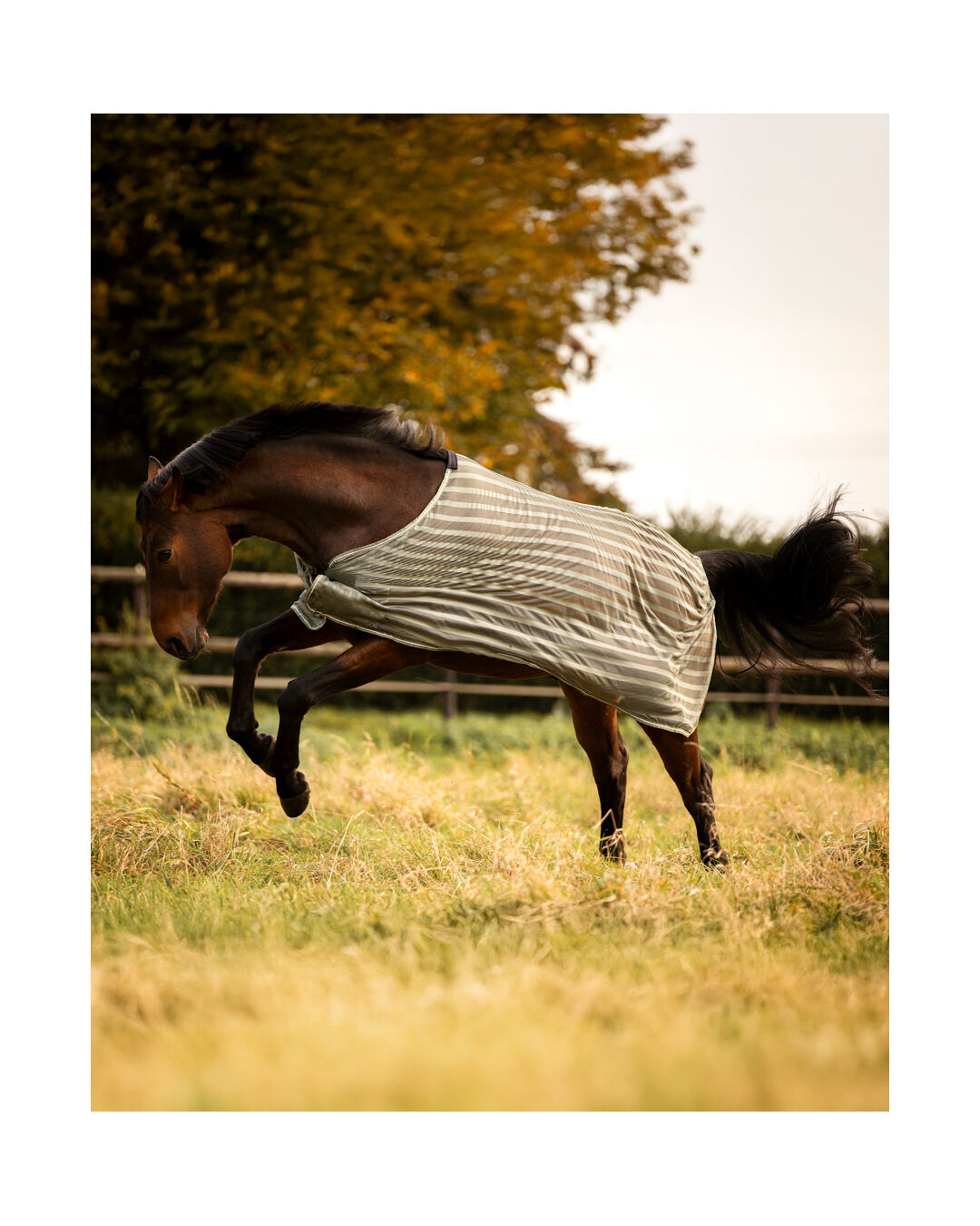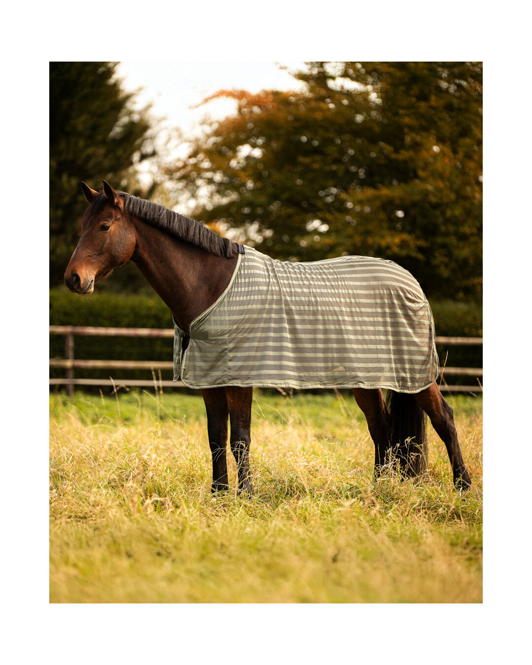Dank des praktischen Steckverschlusses an der Brust und dem Schweifriemen sitzt die Decke sicher, ohne dabei einen Bauchverschluss zu benötigen. Der auffällige Streifen-Look sorgt für eine stilvolle Optik.
