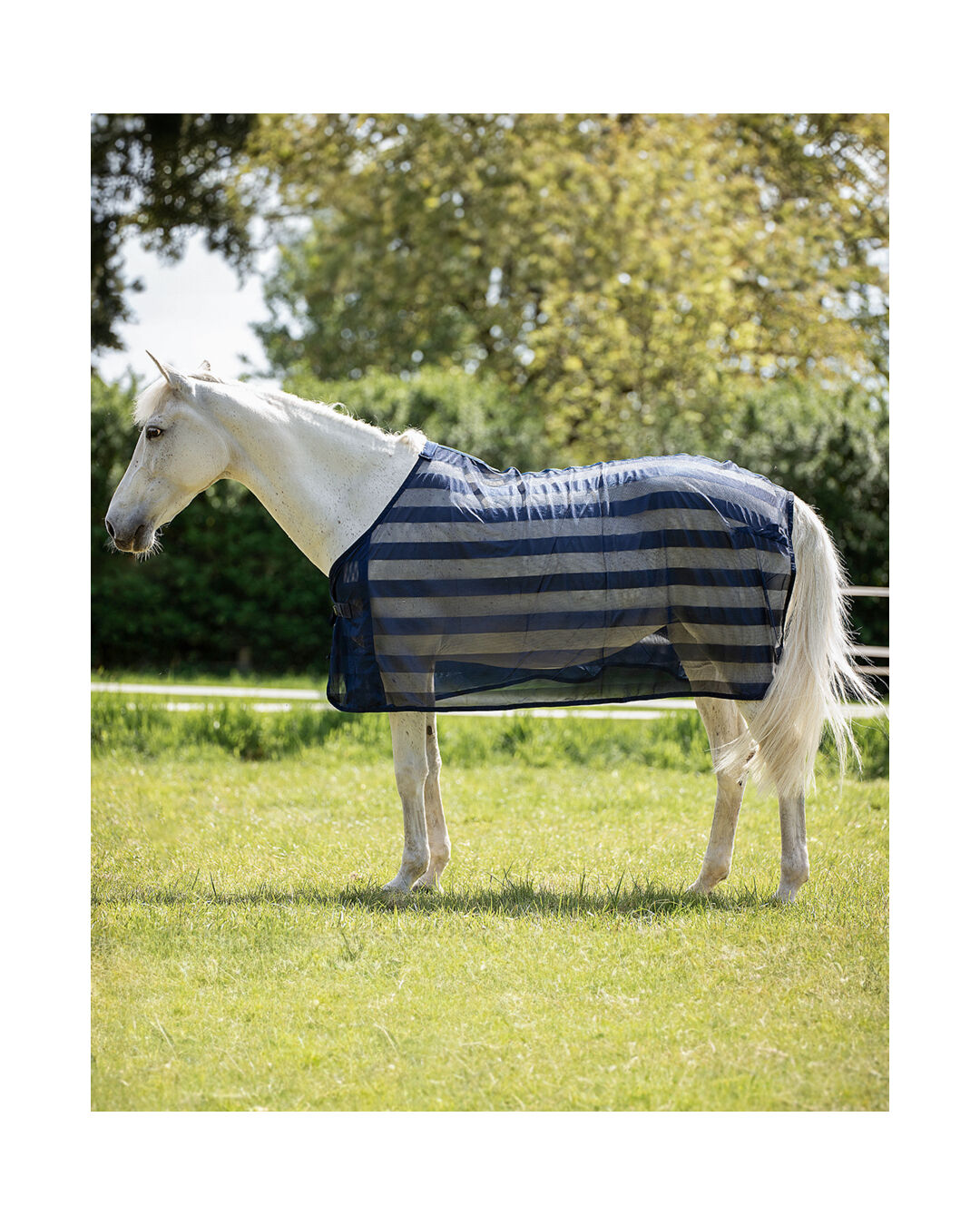 Dank des praktischen Steckverschlusses an der Brust und dem Schweifriemen sitzt die Decke sicher, ohne dabei einen Bauchverschluss zu benötigen. Der auffällige Streifen-Look sorgt für eine stilvolle Optik.