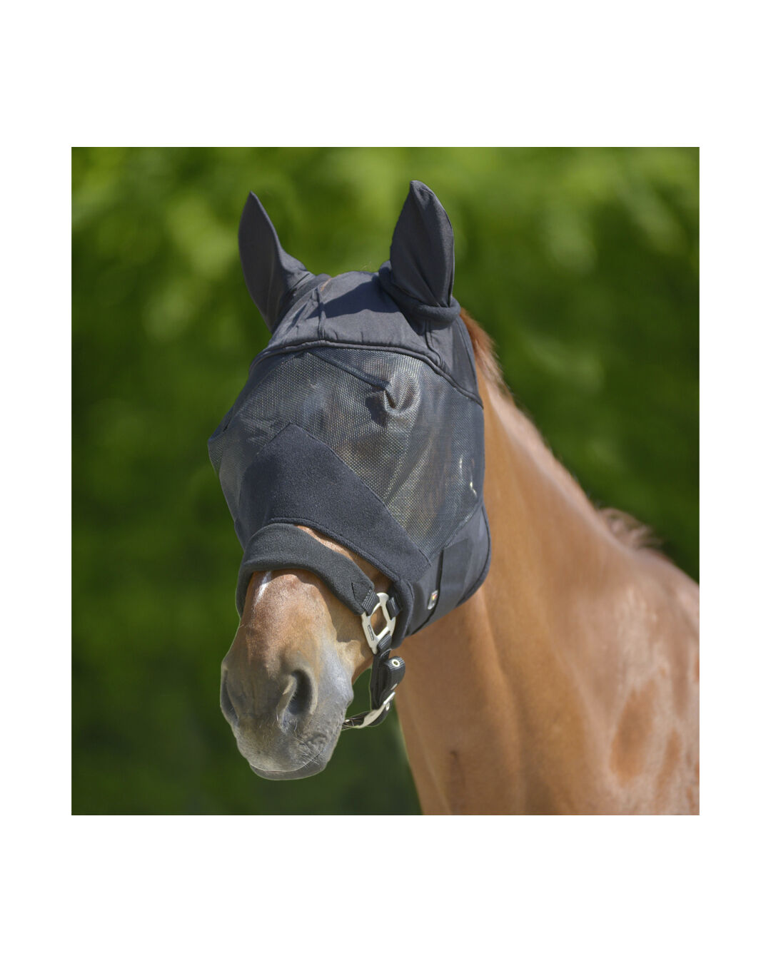 Die Maske ist speziell für den Einsatz im Freien konzipiert und verfügt über einen Schopfdurchlass, der das Tragen der Maske auch bei langer Mähne ermöglicht. Dank der Elastikeinsätze und Klettverschlüsse ist die Maske individuell anpassbar und bietet einen hohen Tragekomfort. Die weiche Fleece-Polsterung sorgt zusätzlich für ein angenehmes Tragegefühl und schützt die empfindliche Haut deines Pferdes vor Reibung und Druckstellen.