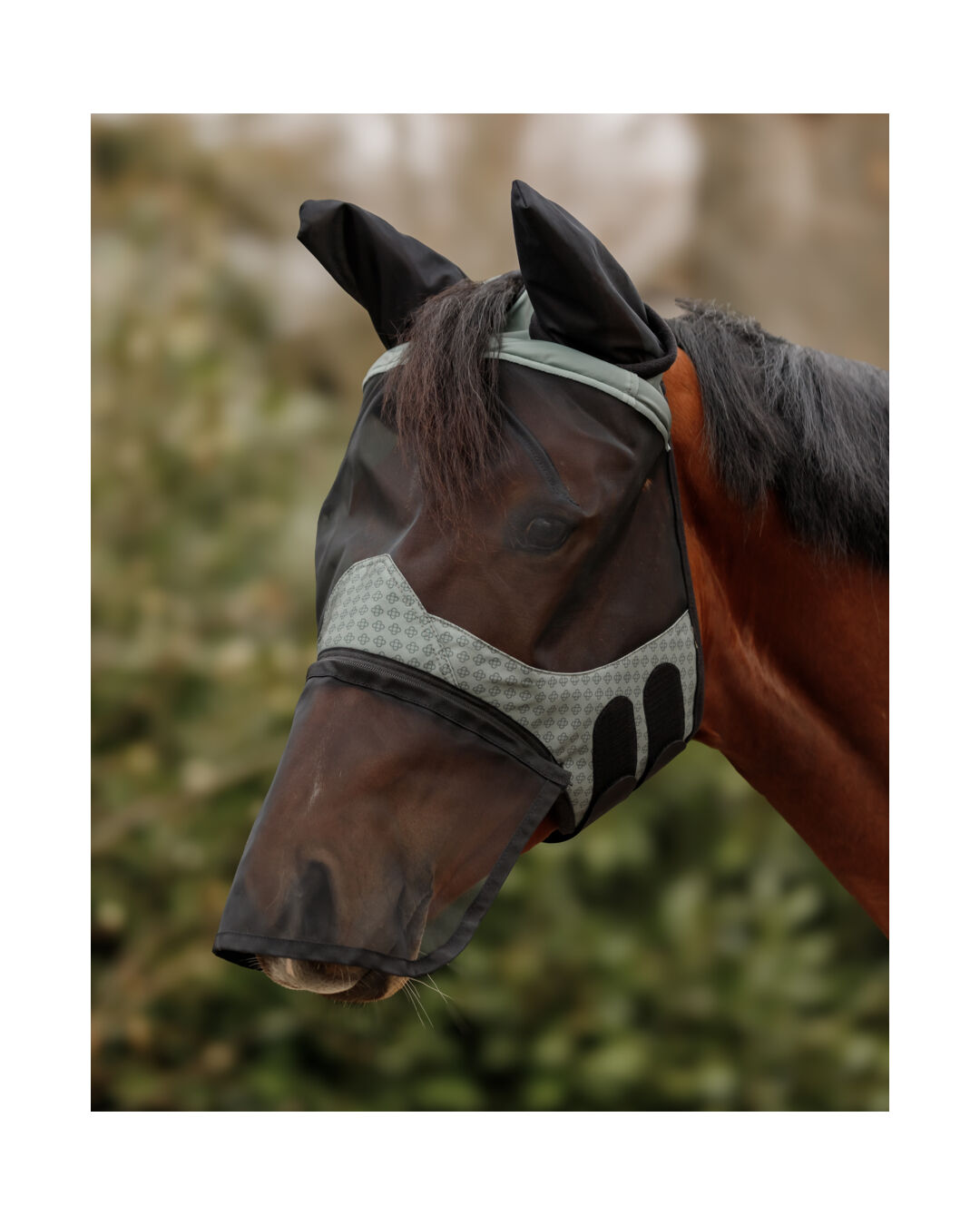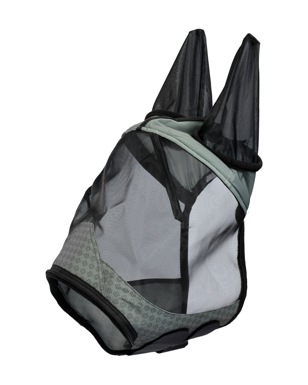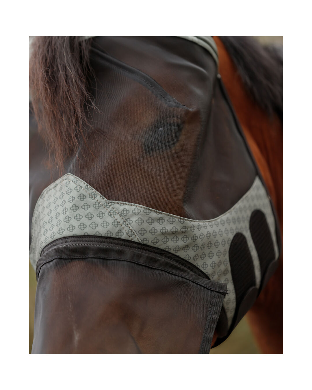 Sie verfügt über einen abnehmbaren Nasenschutz und einen Nasenbereich mit einem stylischen All-over-Print des 4Horses-Logos. Die Kombination aus weichem, elastischem Polyester und atmungsaktivem Mesh-Material an den Ohren sorgt für hohen Tragekomfort und Schutz vor Insekten.