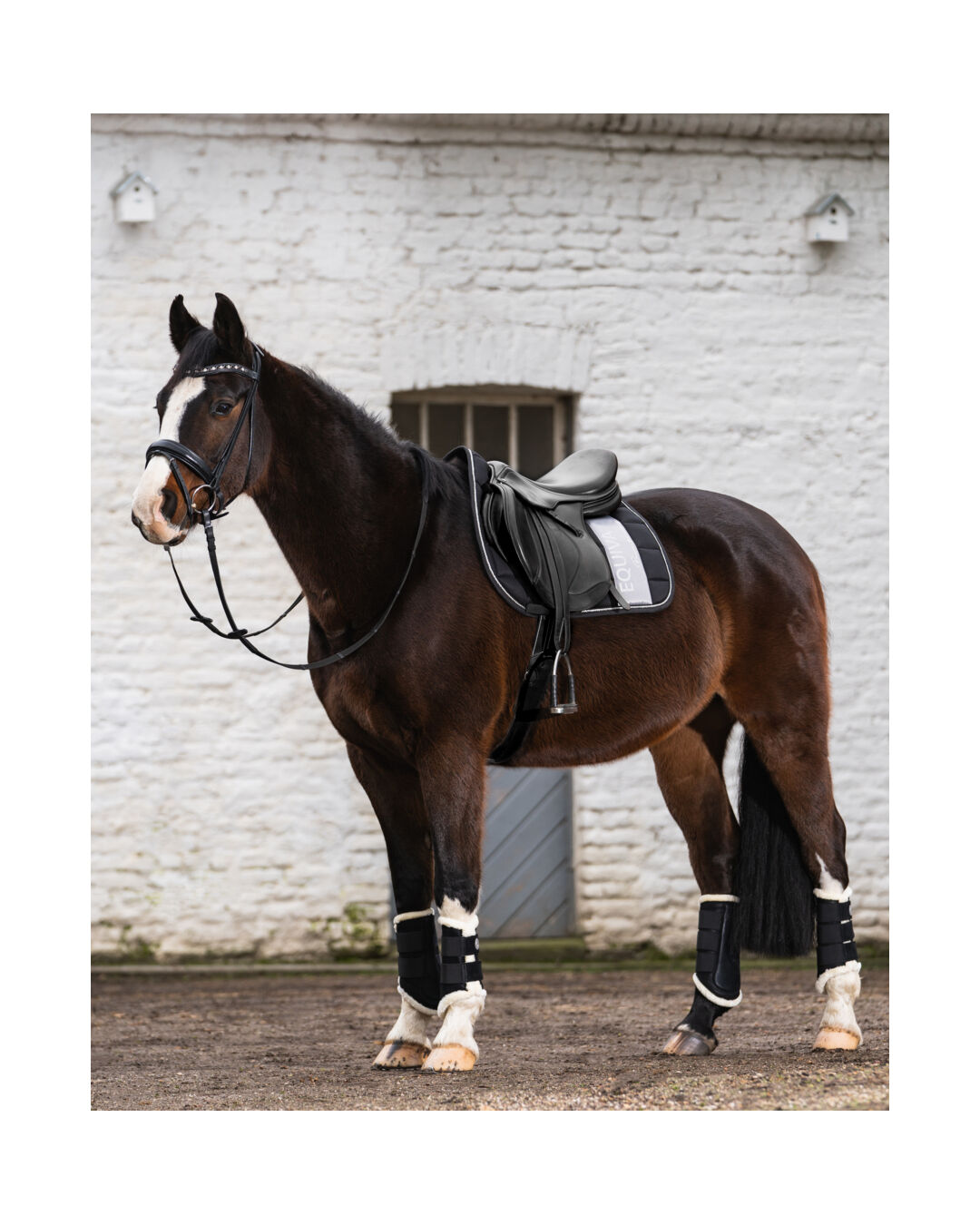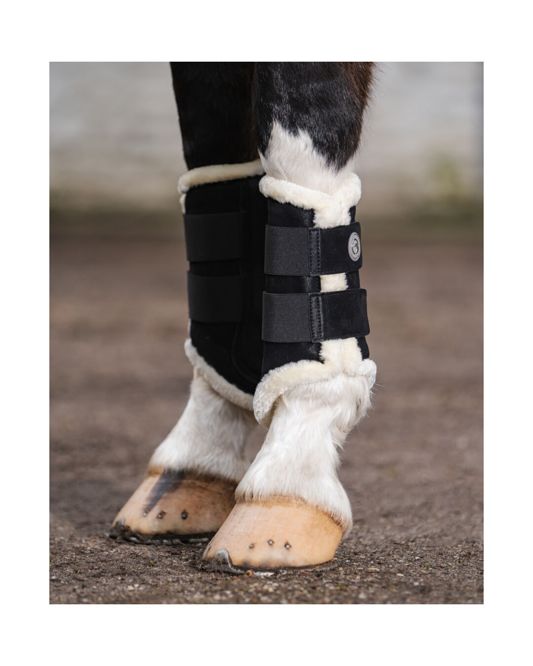 Die zusätzliche Polsterung an der Innenseite gewährleistet dem Pferdebein einen optimalen Schutz und die breiten Klettverschlüsse sorgen für einen festen Halt ohne verrutschen. Ein besonderes Detail der Gamaschen sind die Klettverschlüsse in edler Satin-Optik und mit dezenter Logo-Musterung.
