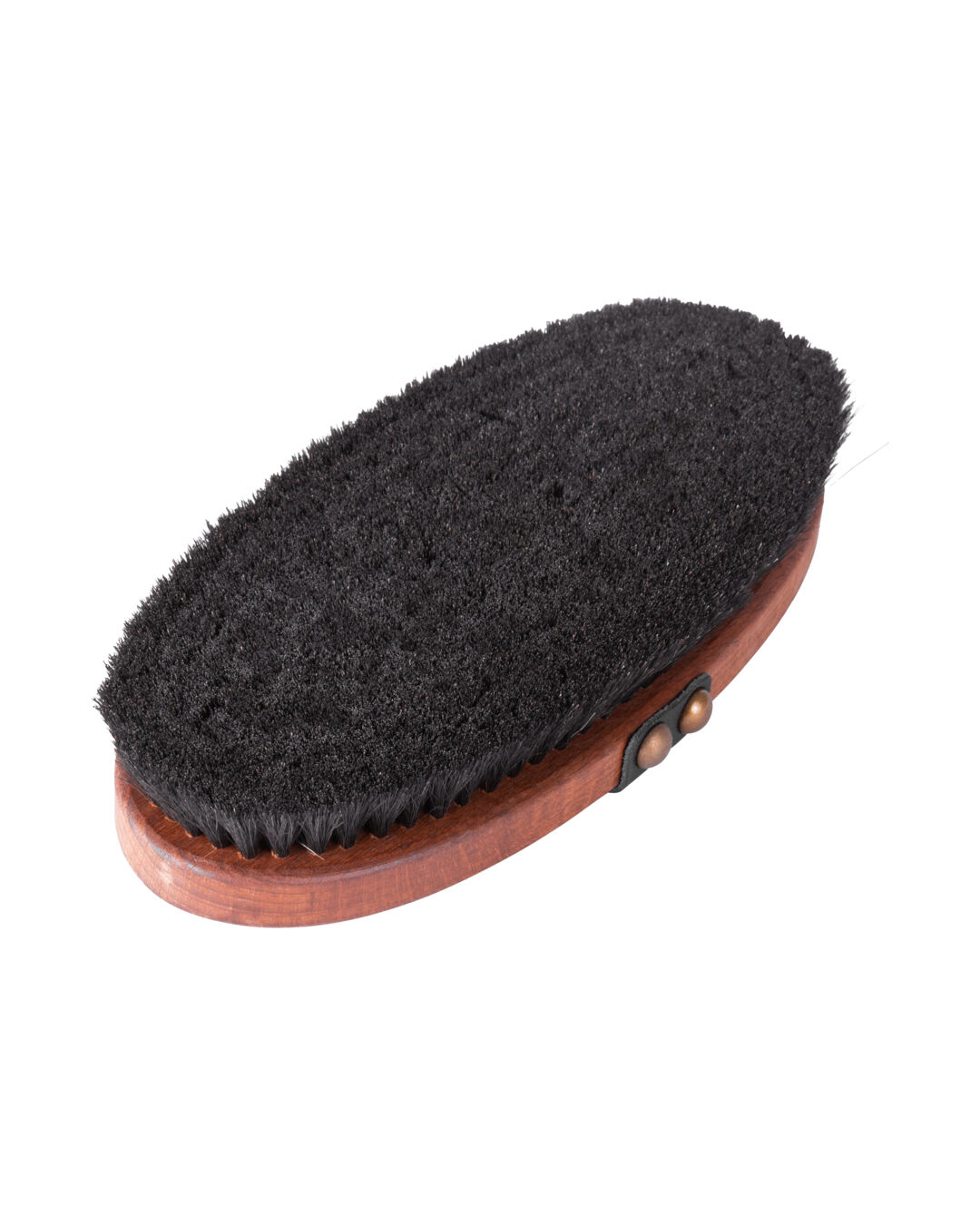 Der Bürstenkörper aus Thermobuche verleiht dieser Kardätsche eine herausragende Langlebigkeit und widerstandsfähige Eigenschaften. Die Borsten bestehen aus einer harmonischen Mischung aus Ziegenhaar und Rosshaar, die außergewöhnlich weich sind und eine zärtliche Pflege ermöglichen. Mit einem schwarzen Ledergurt ausgestattet, liegt die Kardätsche sicher in der Hand und erleichtert die Anwendung.