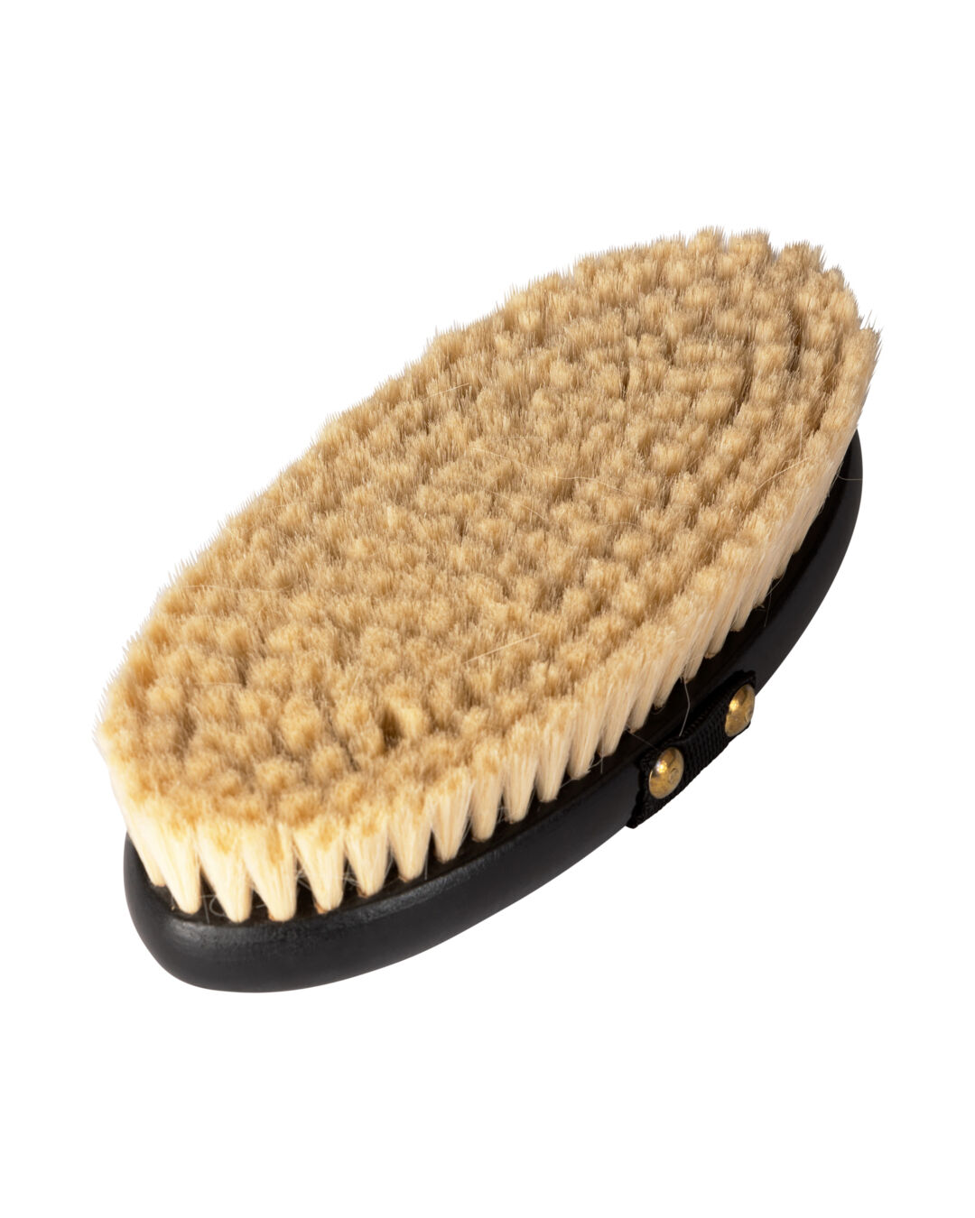 Der Bürstenkörper besteht aus einem strapazierfähigen Holz. Die Bürste ist mit weichen Borsten ausgestattet, die sich optimal für sensible Stellen deines Pferdes eignen.
