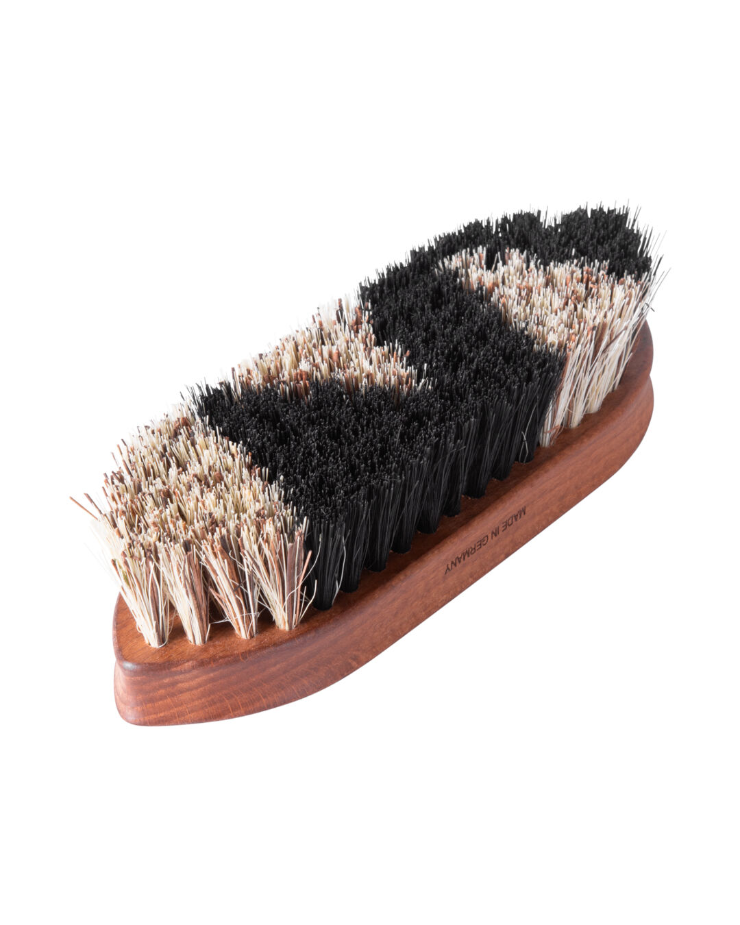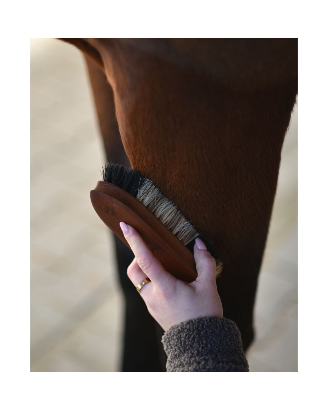 Die 4Horses kurze Wurzelbürste Majesty ist eine Wurzelbürste mit einem Bürstenkörper aus Thermobuche – das macht sie noch langlebiger und widerstandsfähiger. Die zweifarbigen Naturborsten aus Union Fibre und schwarzem Fibre bilden ein Muster.