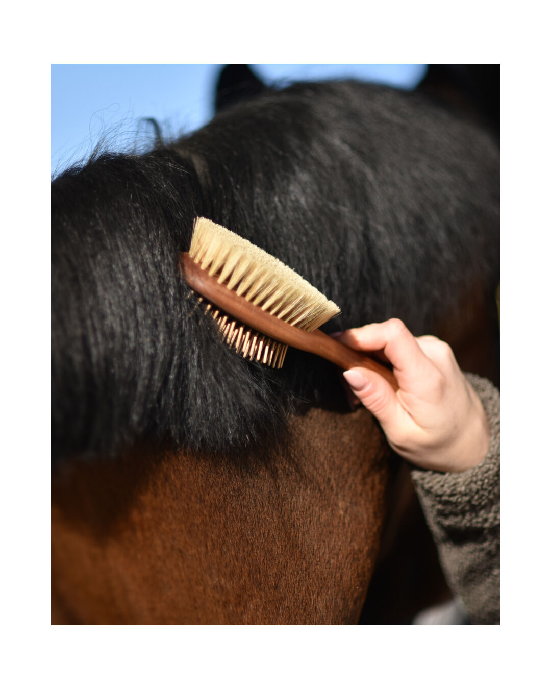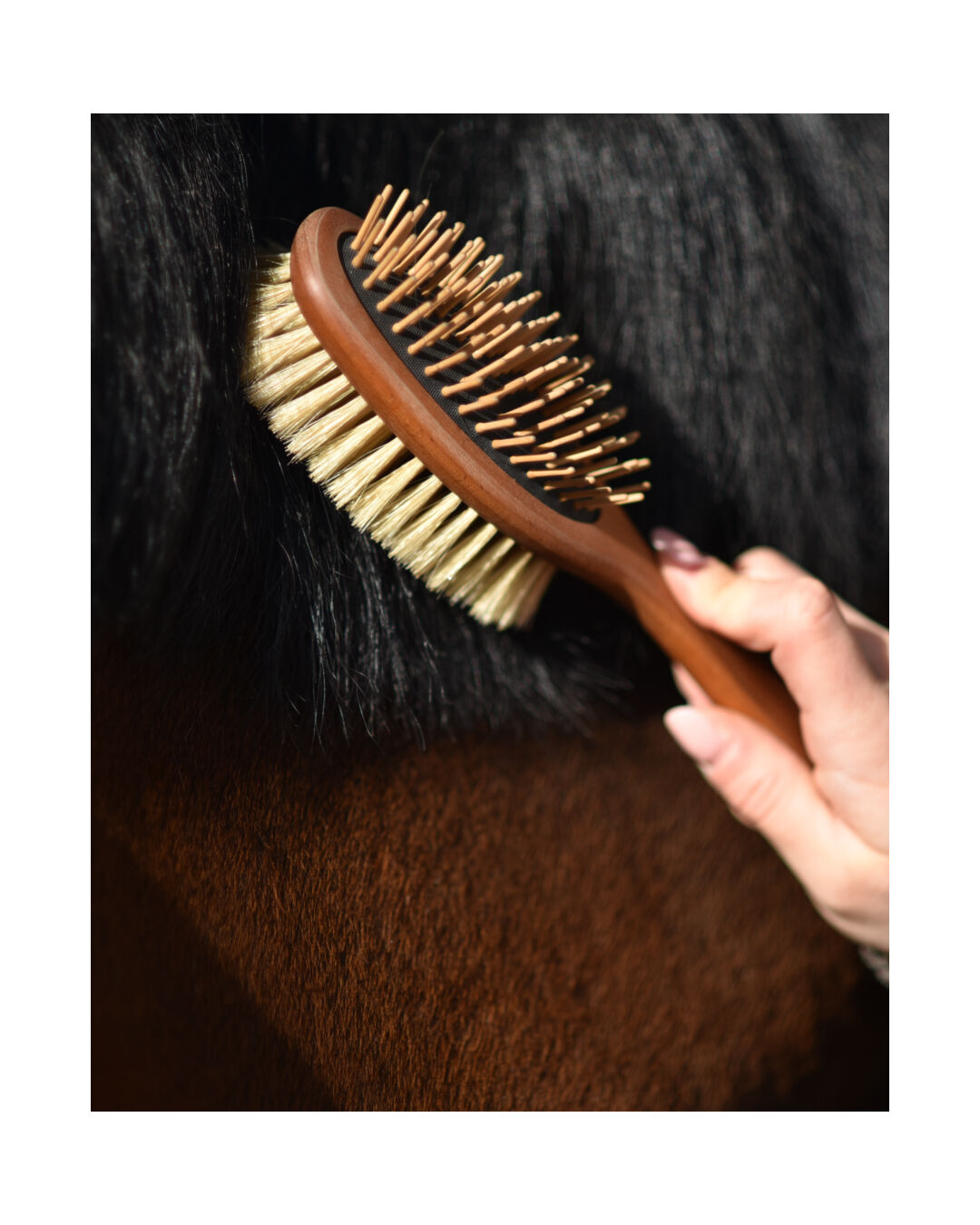Diese hochwirksame Bürste ist mit einer raffinierten Konstruktion ausgestattet, die selbst hartnäckige Verwicklungen im Handumdrehen löst. Die Bürste verfügt über echte Holzstifte, gefertigt aus Thermobuche, was ihnen eine außergewöhnliche Langlebigkeit und Robustheit verleiht. Das schwarze Naturkautschukkissen sorgt für eine optimale Flexibilität und ein angenehmes Handling während der Anwendung. Die doppelseitige Mähnen- und Schweifbürste Majesty von 4Horses ist der zuverlässige Begleiter für die Pflege von Mähne und Schweif deines Pferdes. Vertraue auf ihre erstklassige Leistung und hochwertige Materialien, um das Fell deines Pferdes in bestem Zustand zu halten.