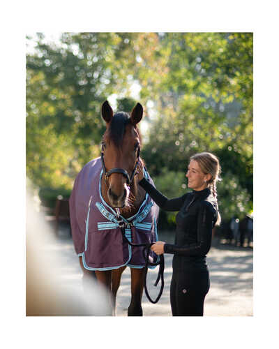 Gefertigt aus hochrobustem 1200 Denier Material bietet sie dir ein Plus an Langlebigkeit und Widerstandsfähigkeit. Die wasserdichte und atmungsaktive Qualität hält dein Pferd trocken und sorgt gleichzeitig für ein angenehmes Klima unter der Decke. Mit dem Triple-Lock Brustverschlusssystem sitzt die Decke sicher, wobei du verschiedene Möglichkeiten hast, sie zu schließen. Die Kreuzbegurtung gibt zusätzlichen Halt. Ein großer Schweiflatz mit Reflexstreifen und Silikonschweifriemen schützt vor Zugluft und sorgt für Sichtbarkeit bei Dämmerung.