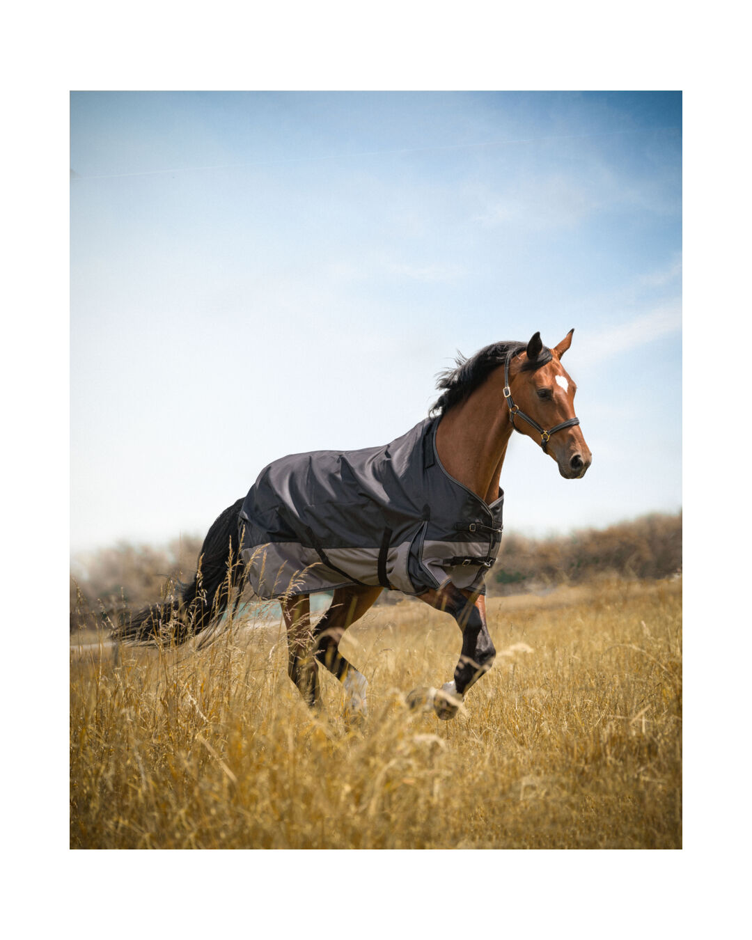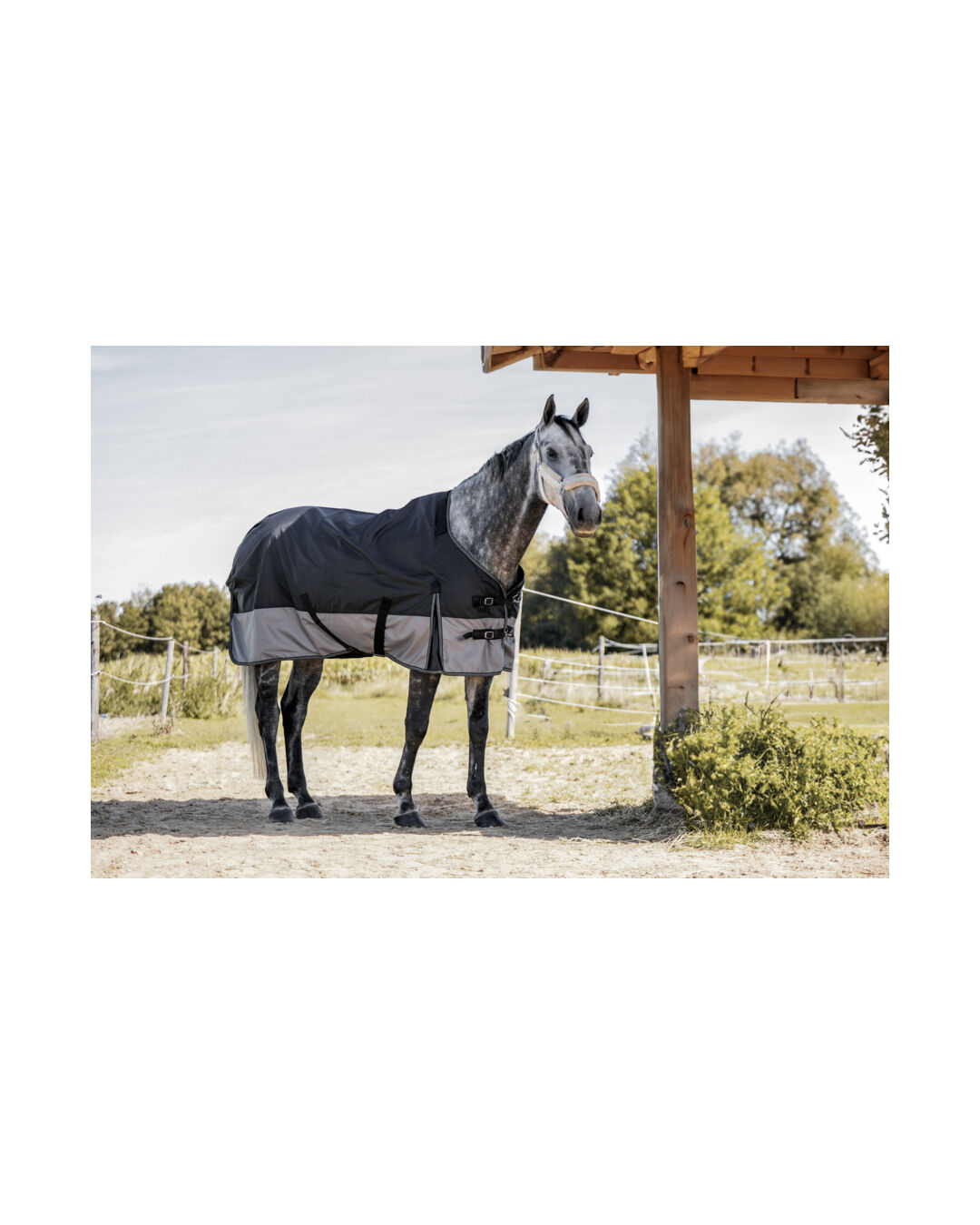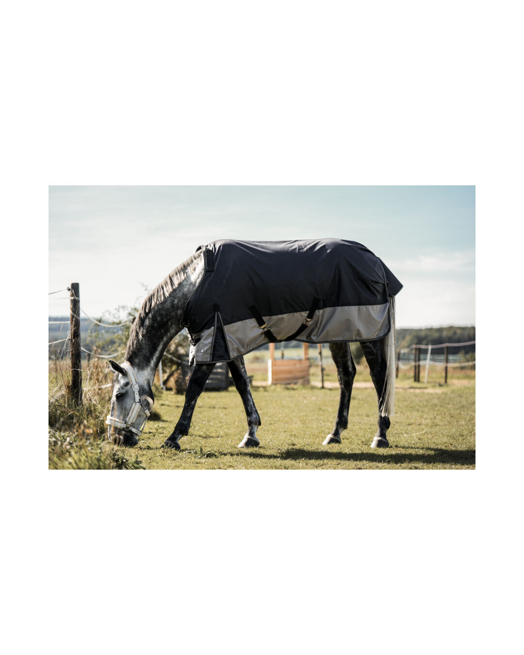 Das Widerrist-Teil ist zusätzlich mit weichem Fleece ausgekleidet, um Scheuerstellen zu verhindern, während die Gehfalte und der Schweiflatz für mehr Bewegungsfreiheit und zusätzlichen Schutz sorgen. Optisch überzeugt die Kopenhagen-Decke im eleganten zweifarbigen Look mit silbern schimmernden Nähten. Ein weiteres praktisches Detail: Mit Klettverschlüssen kannst du an der Vorderseite der Decke optional ein Halsteil anbringen.
