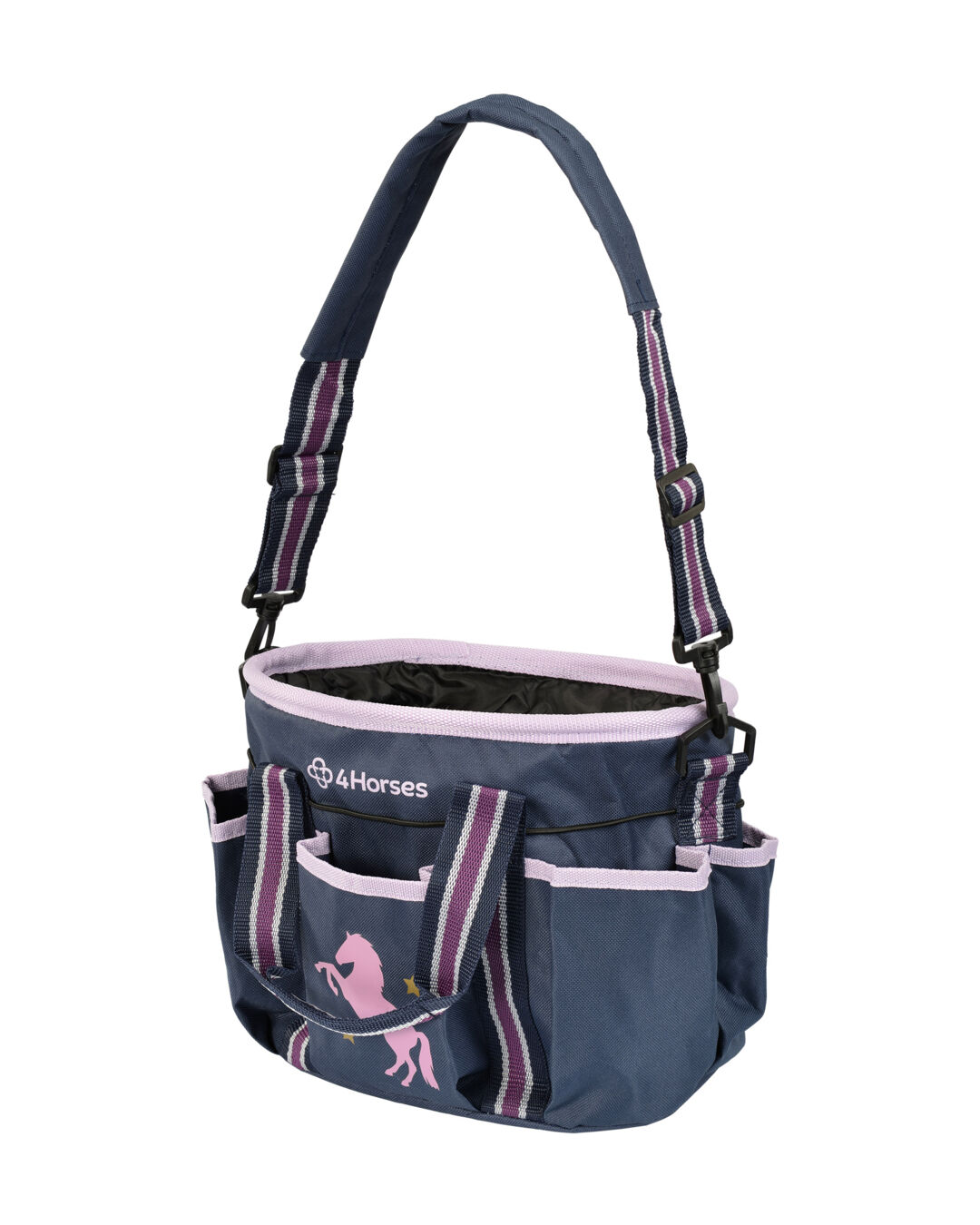 Dank ihres großzügigen Innenraums hast du im Stall oder beim Turnier immer alles griffbereit. Die Tasche kann entweder über die zwei stabilen Griffe getragen oder durch den praktischen Schultergurt bequem umgehängt werden. Die zahlreichen Außentaschen bieten zusätzlichen Stauraum für Kleinigkeiten, die du schnell zur Hand haben möchtest. Das fröhliche Design mit Pferdemotiven macht die Putztasche zu einem echten Hingucker und sorgt dafür, dass auch unsere kleinsten Reiter ihre Freude daran haben.
