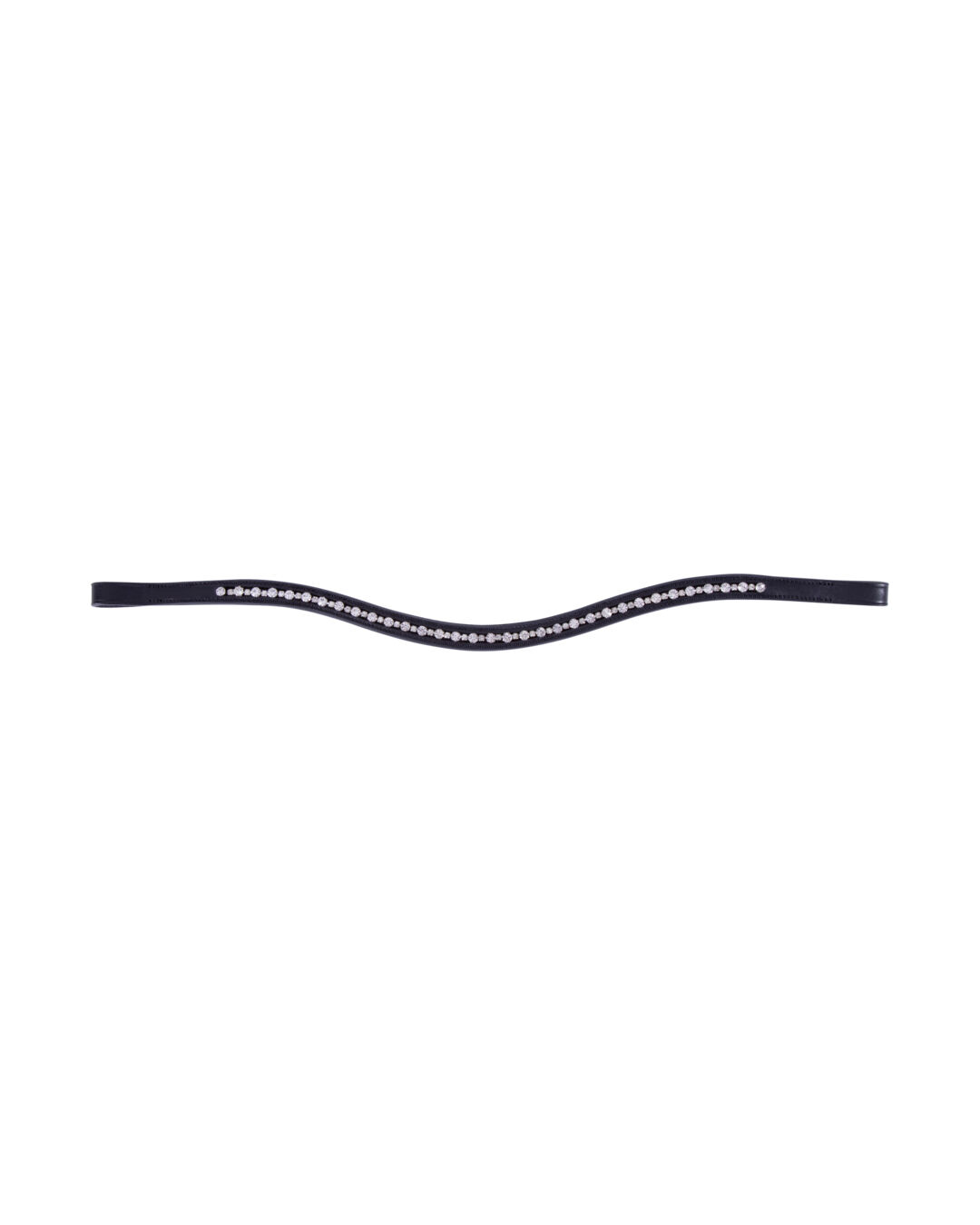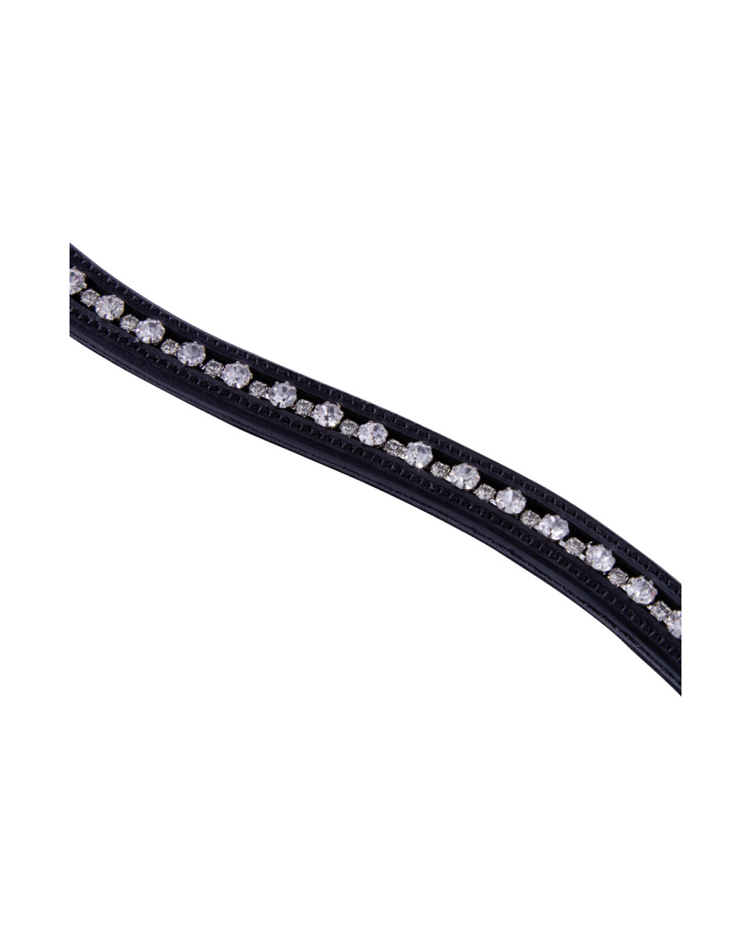 Geschwungener Stirnriemen Neustadt aus Leder von 4Horses aus Leder mit großen und kleinen, silbernen Strasssteinen in einer Reihe. Das Stirnband von 4Horses ist besonders klassisch und edel und ein Hingucker für jeden Trensen- oder Kandarenzaum.
