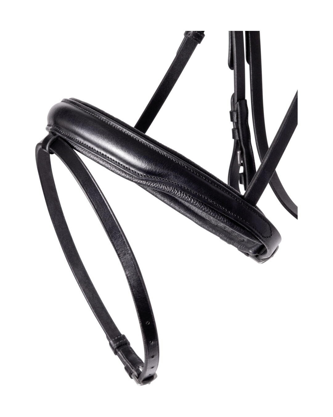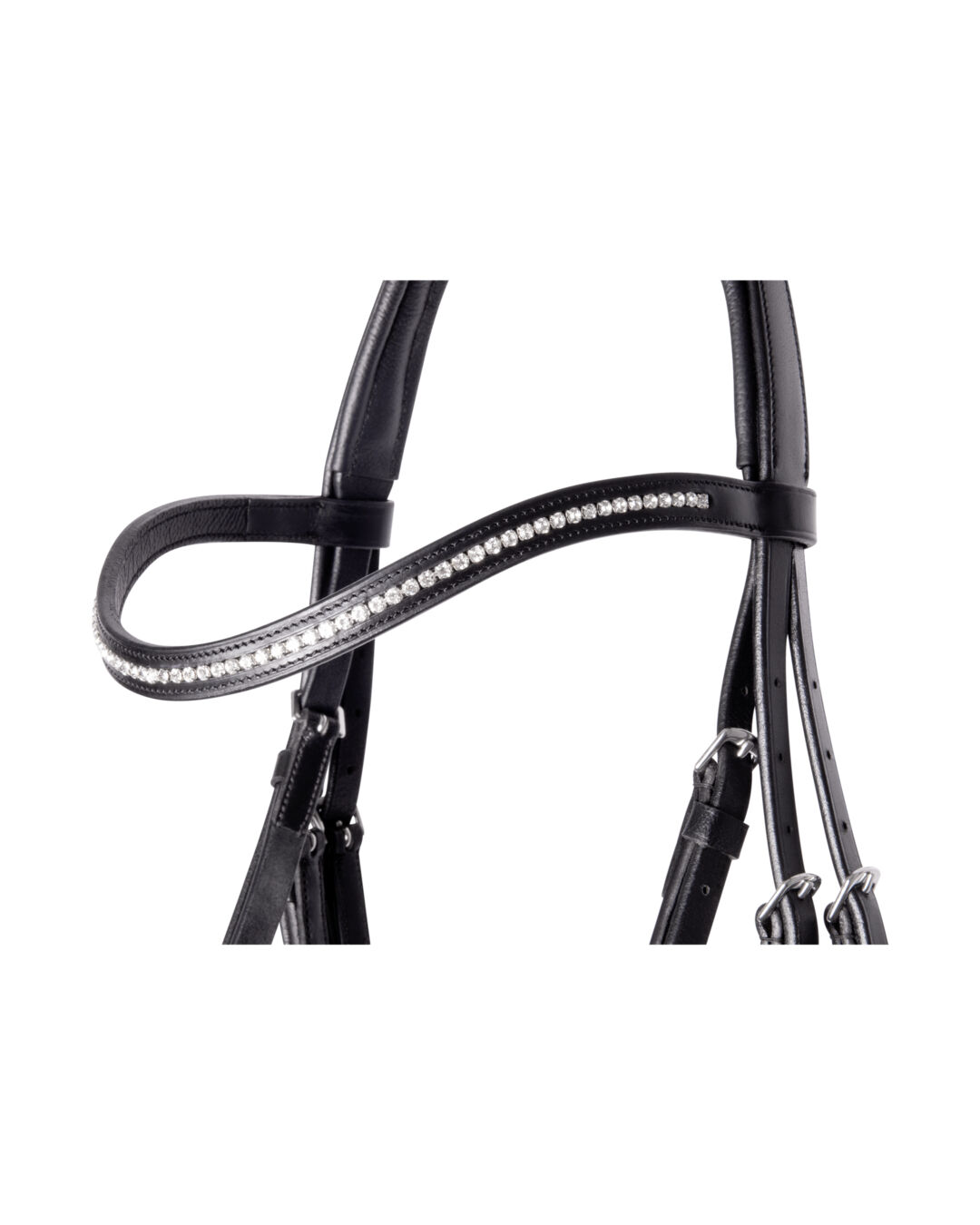 Die Trense wirkt durch seine weißen Steinchen am geschwungenen Stirnband äußerst edel. Das anatomische Genickstück wurde speziell entworfen, um die natürlichen Konturen des Pferdekopfes zu berücksichtigen und den Druck an empfindlichen Stellen zu reduzieren. Für noch mehr Komfort ist die Trense weich unterlegt. Zusätzlich zur Trense erhältst du die passenden Gurtzügel.