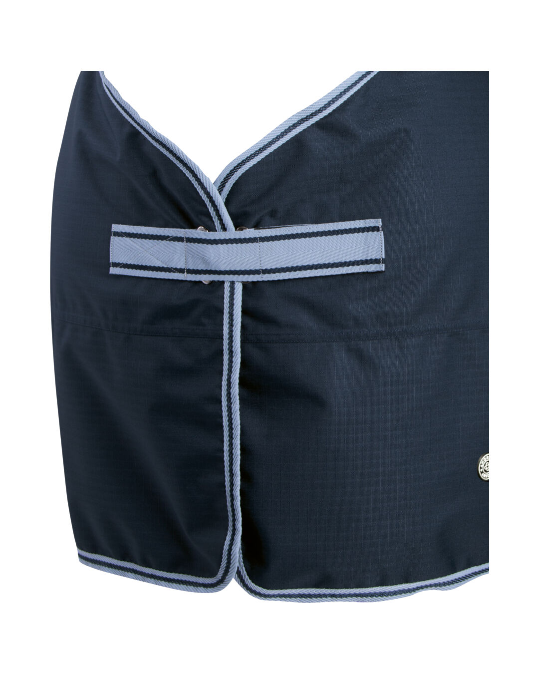 Einfach in der Handhabung ist sie durch den klassischen T-Verschluss an der Brust, ergänzt durch einen Klettverschluss für extra Stabilität. Die Kreuzbegurtung hält die Decke sicher an Ort und Stelle, und über integrierte Ringe lassen sich bei Bedarf Beinschnüre anbringen. Der Schweiflatz schützt zusätzlich vor Zugluft und Nässe von hinten.