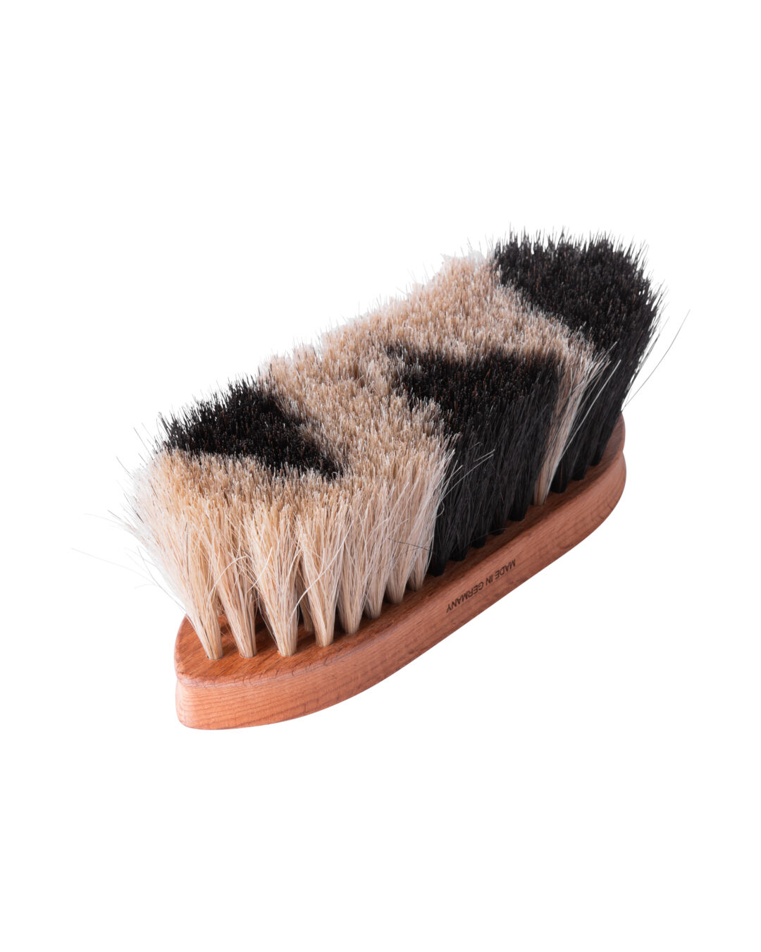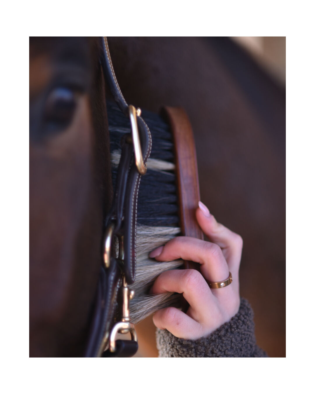 Der Bürstenkörper, aus robustem Thermobuchenholz gefertigt, verleiht dieser Bürste eine außergewöhnliche Langlebigkeit und Widerstandsfähigkeit. Die Borsten aus hochwertigem Rosshaar präsentieren sich in einem reizvollen zweifarbigen Design. Diese Bürste gewährleistet nicht nur eine gründliche Pflege für dein Pferd, sondern ist auch ein optisches Highlight in jeder Pflegekollektion – vertraue auf überlegene Qualität und ansprechende Ästhetik mit der 4Horses Wurzelbürste Majesty Rosshaar.