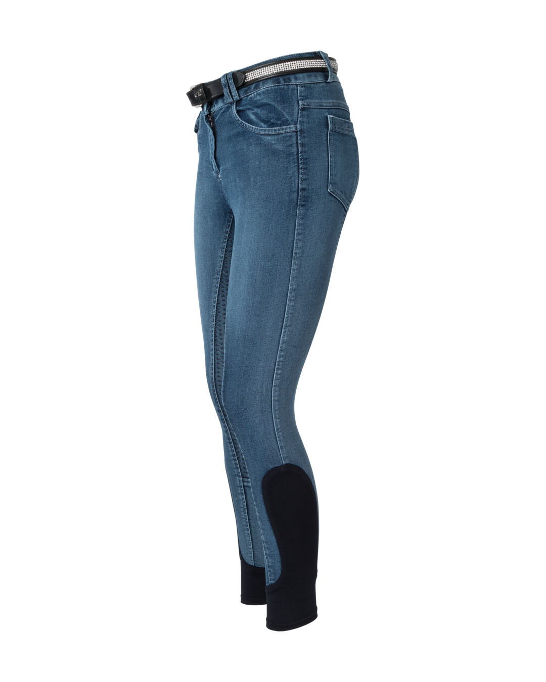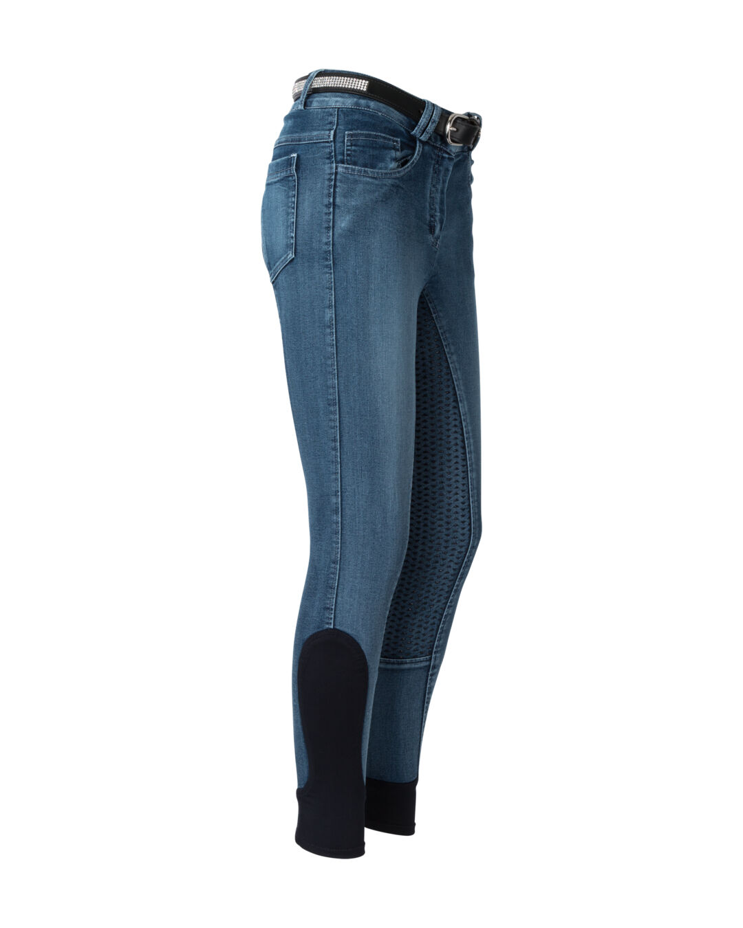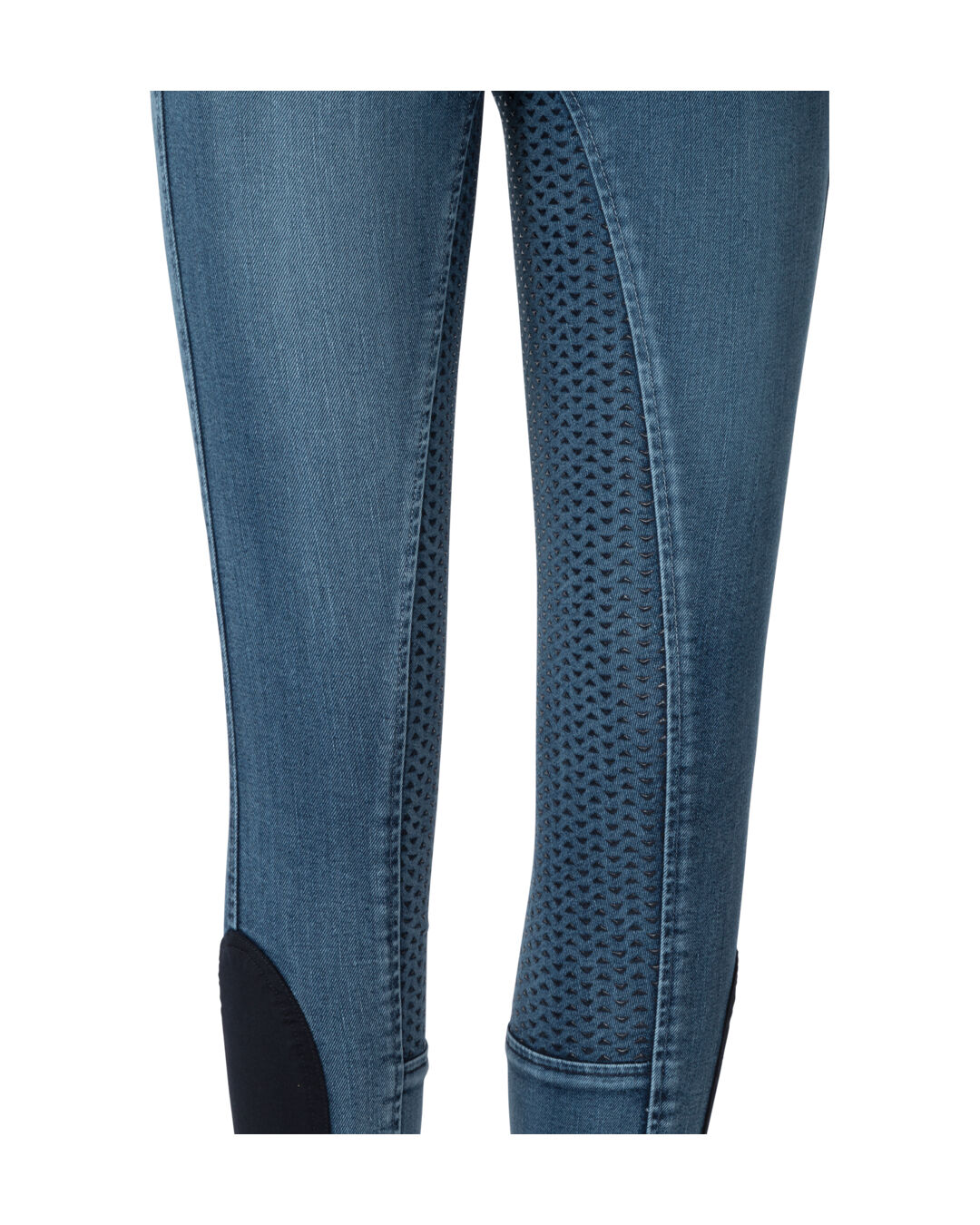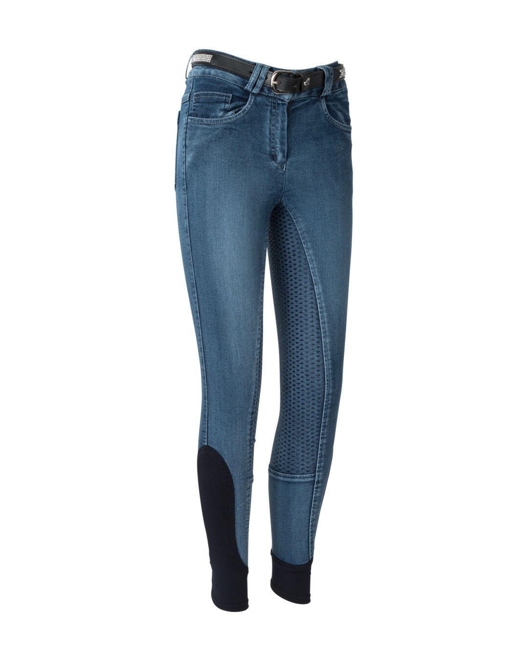 Die modische Damen-Jeansreithose Mia Full Grip von 4Riders kommt im Denim-Look und mit weiß abgesetzten Nähten.