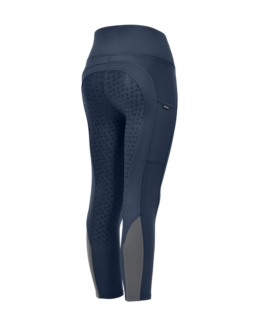 Die Reitleggings hat einen hohen Bund sowie eine seitliche Tasche zum Verstauen von Handy oder Leckerchen.