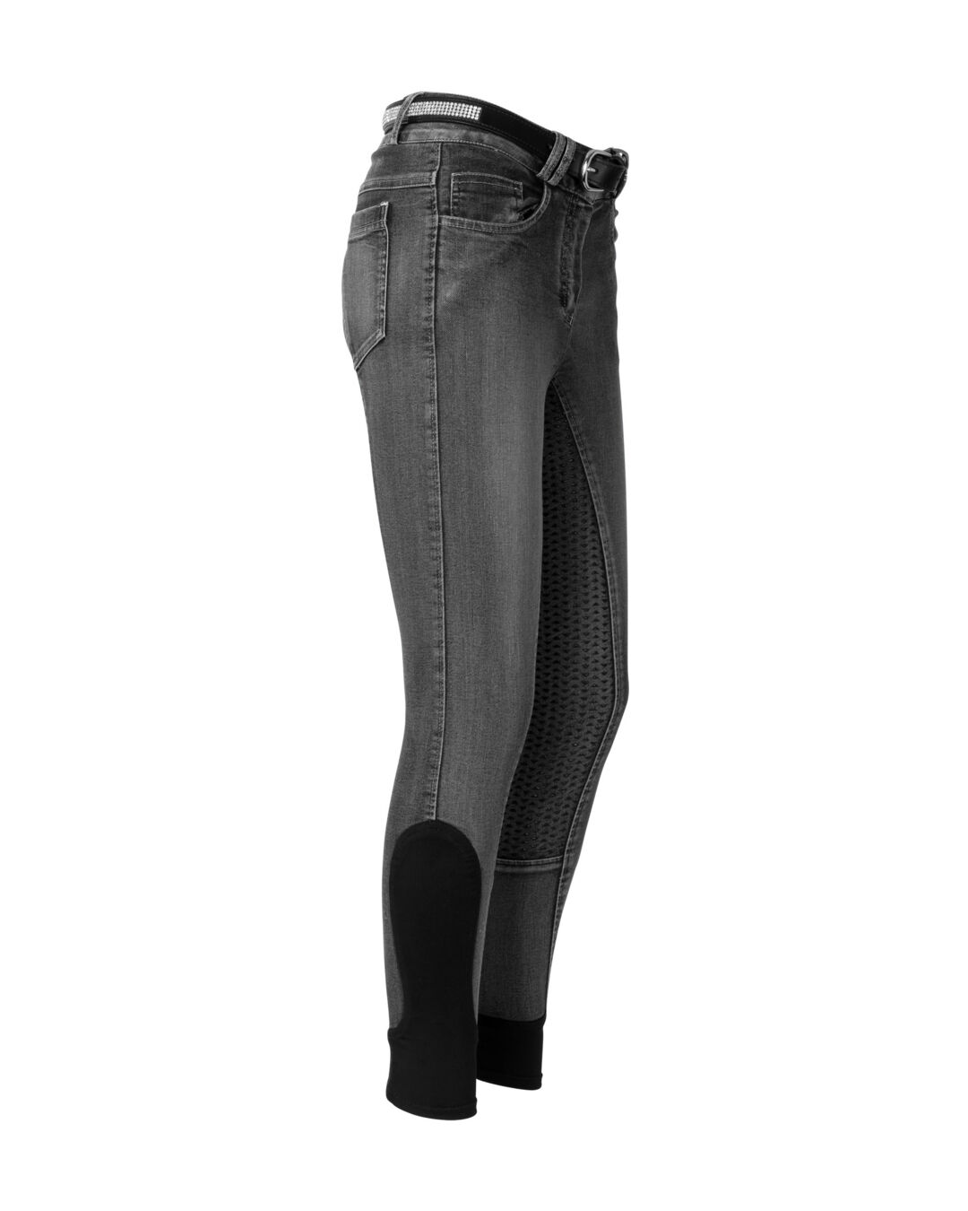 Die modische Kinder-Jeansreithose Mia Full Grip von 4Riders kommt im Denim-Look und mit weiß abgesetzten Nähten.