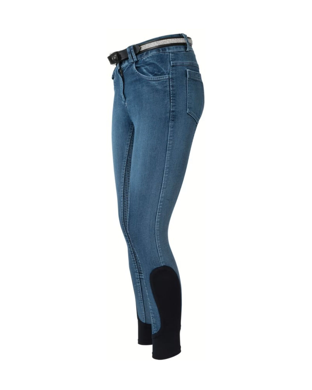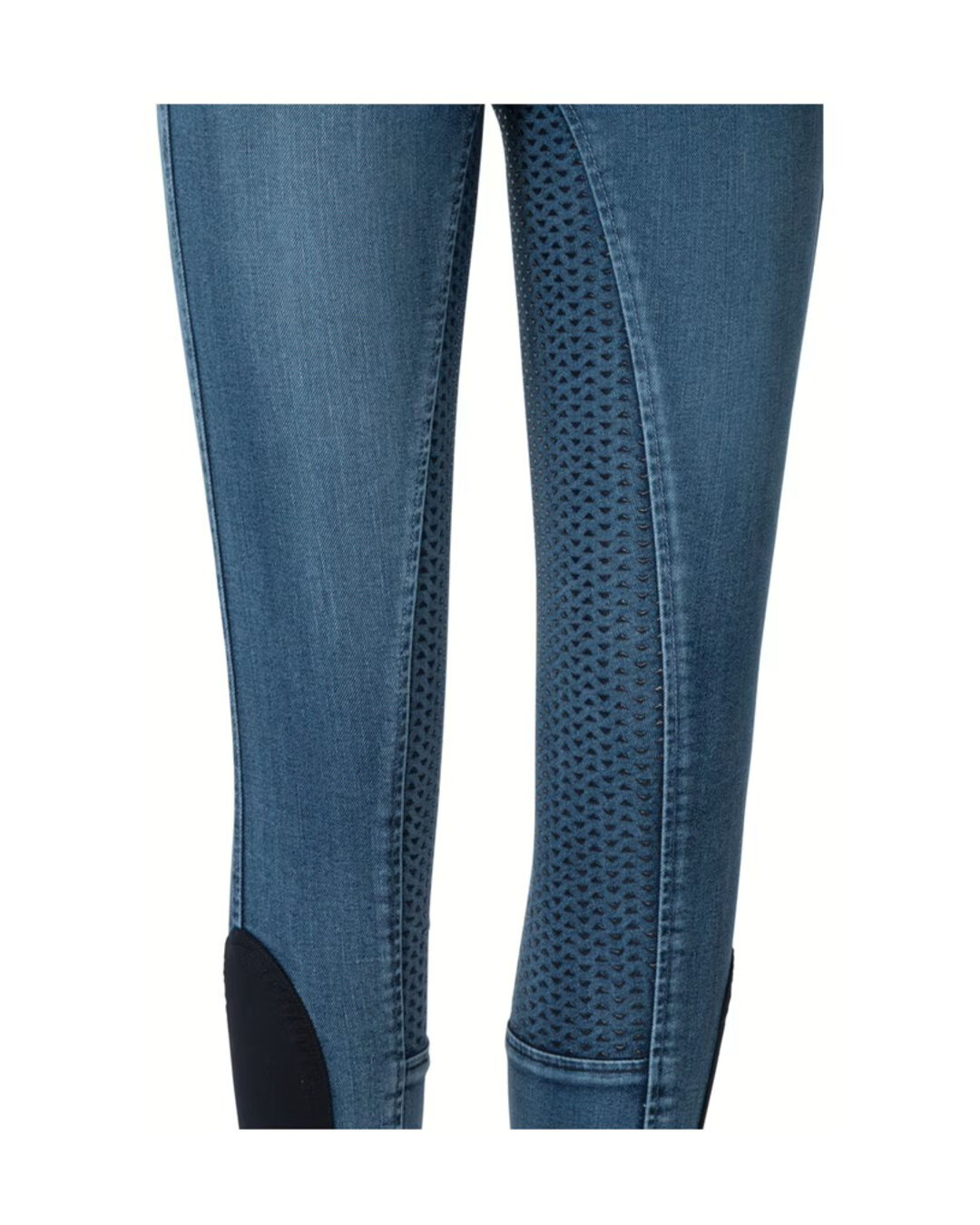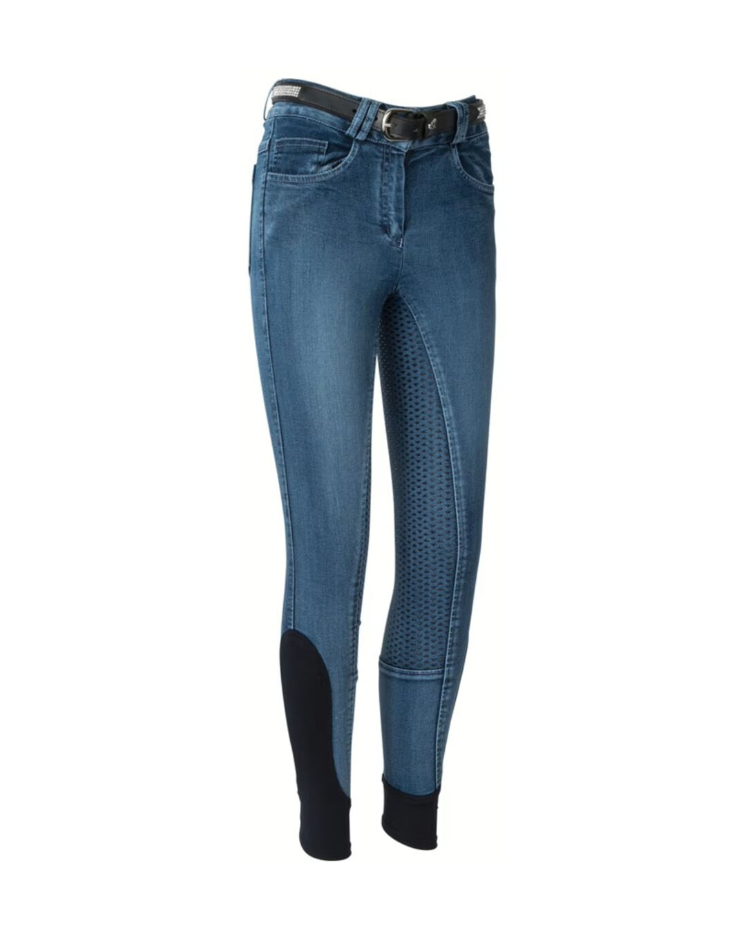 Die modische Kinder-Jeansreithose Mia Full Grip von 4Riders kommt im Denim-Look und mit weiß abgesetzten Nähten.