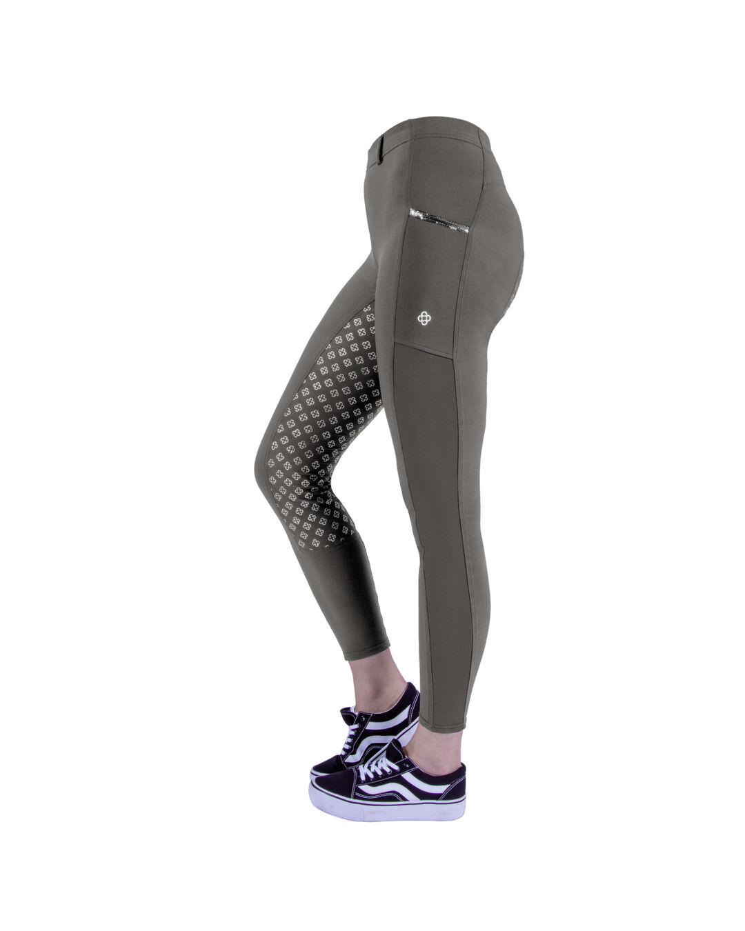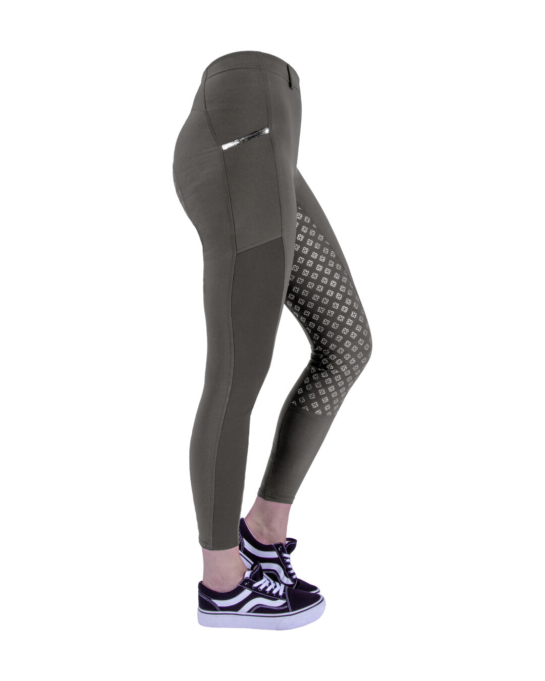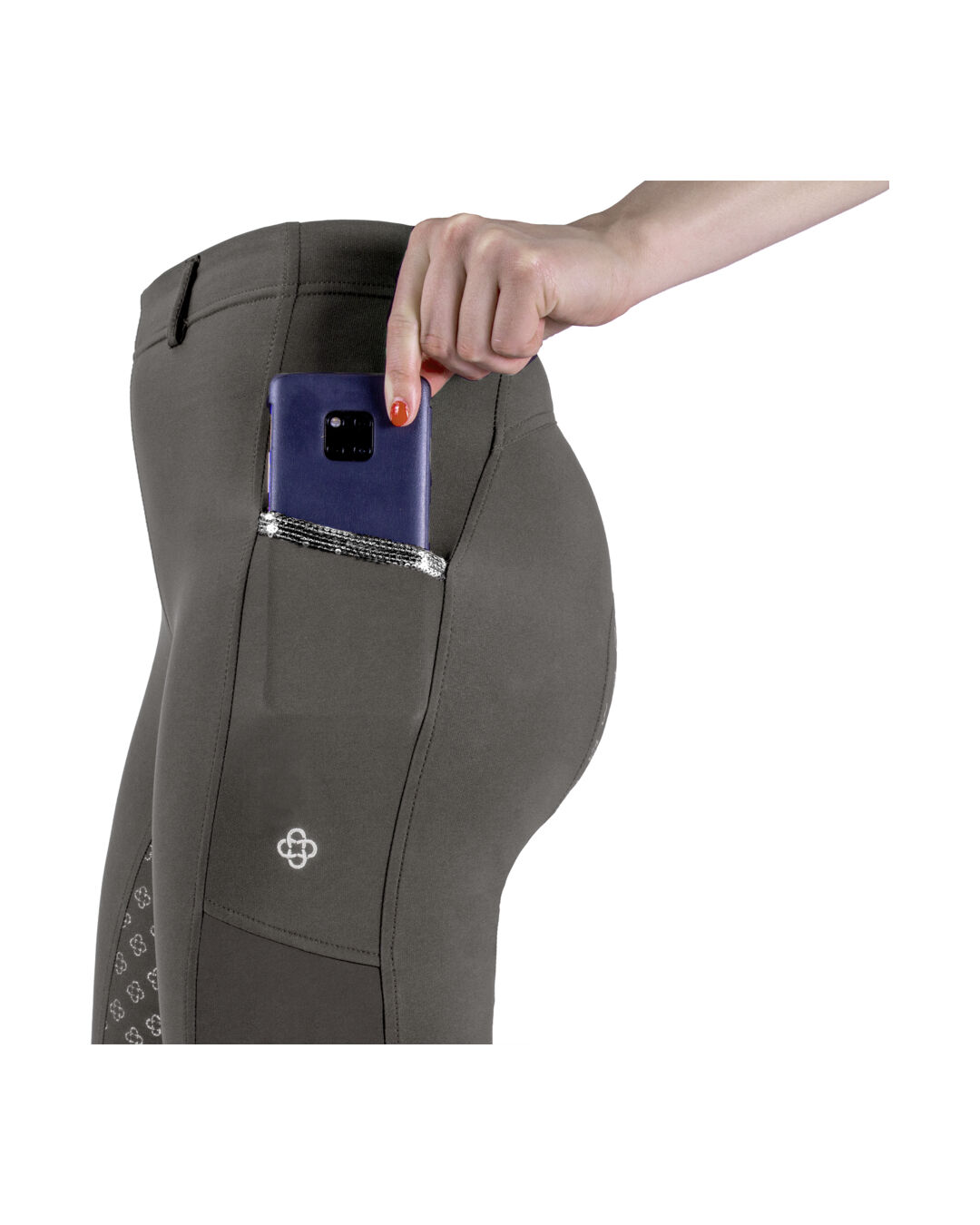 Das leichte, elastische Material sorgt für maximale Bewegungsfreiheit im Sattel und beim Toben im Stall. Der Full Grip bietet zuverlässigen Halt im Sattel – ganz ohne Rutschen. Seitliche Einschubtaschen bieten ausreichend Platz für Handy und Co., während glitzernde Pailletten an den Taschen den Look besonders machen.