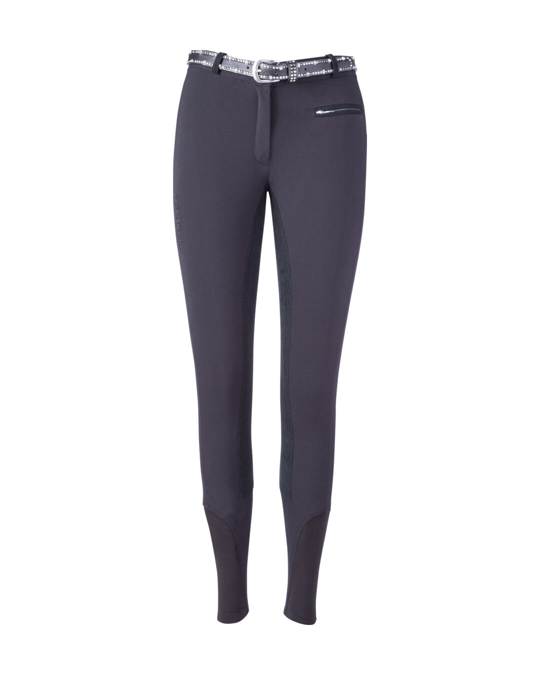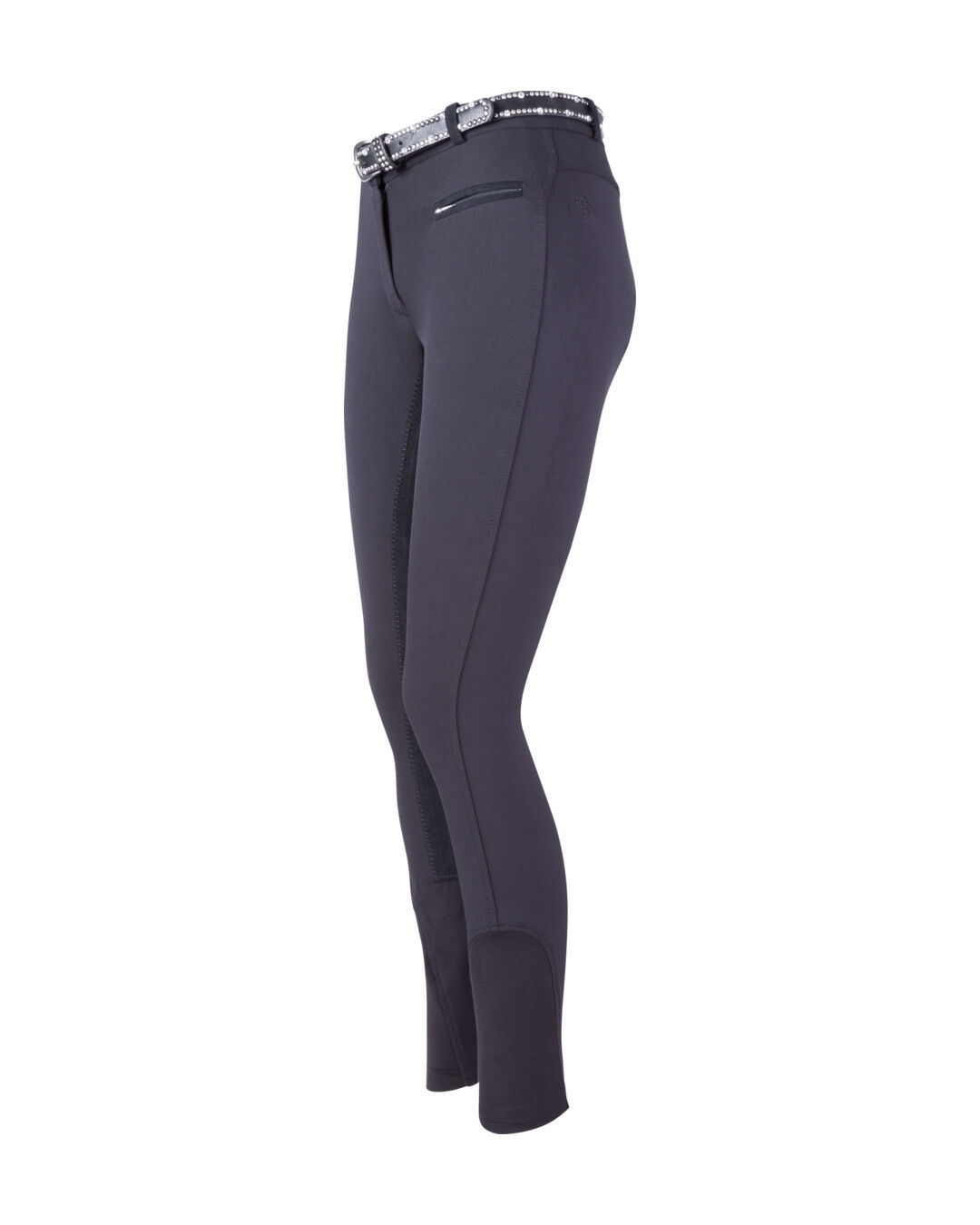 Mit ihrem schlichten Design lässt sich die Hose vielseitig kombinieren. Der Vollbesatz sorgt für sicheren Halt im Sattel, während das elastische Material dir die nötige Bewegungsfreiheit bietet – ob im Training oder bei langen Ausritten. Der flexible Beinabschluss passt sich angenehm an, ohne zu verrutschen, und die Reißverschlusstasche vorne bietet Platz für kleine Essentials.