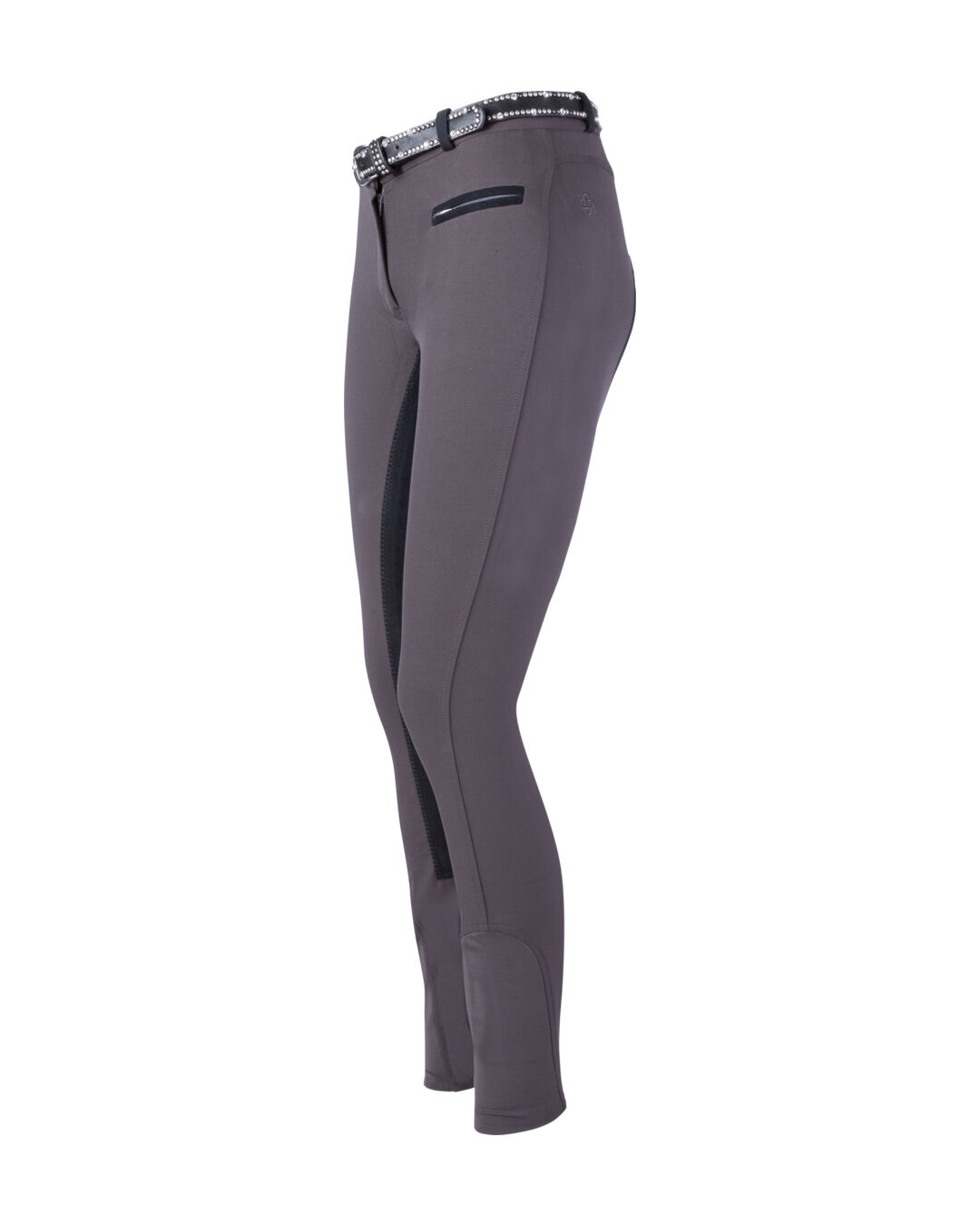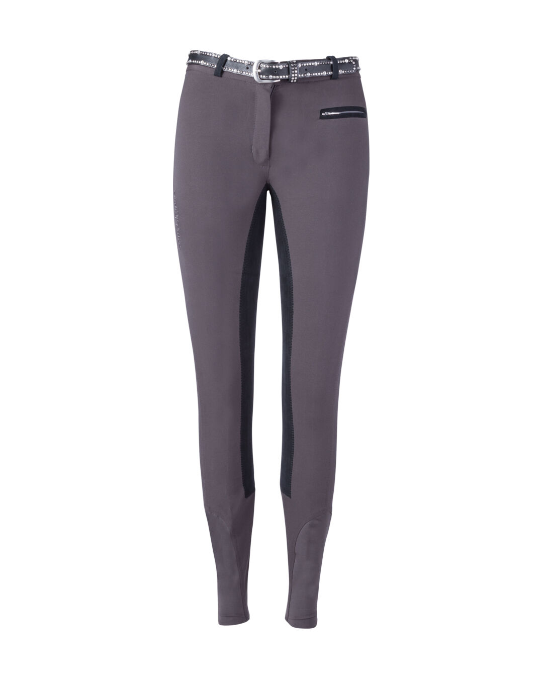 Mit ihrem schlichten Design lässt sich die Hose vielseitig kombinieren. Der Vollbesatz sorgt für sicheren Halt im Sattel, während das elastische Material dir die nötige Bewegungsfreiheit bietet – ob im Training oder bei langen Ausritten. Der flexible Beinabschluss passt sich angenehm an, ohne zu verrutschen, und die Reißverschlusstasche vorne bietet Platz für kleine Essentials.