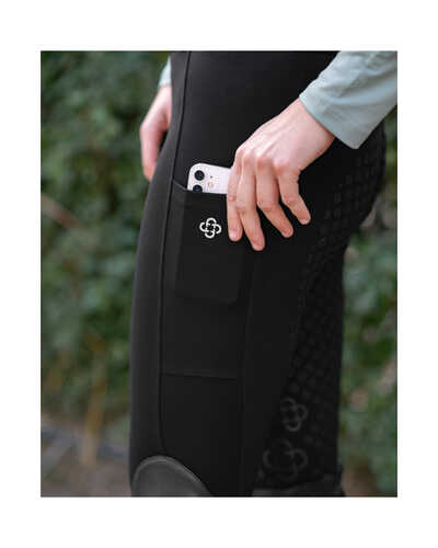 Dank der hohen Taille sitzt sie sicher und formt eine schöne Silhouette. Der Vollbesatz aus griffigem Silikon verleiht dir dabei einen stabilen Sitz im Sattel. Besonders praktisch: die zwei seitlichen Handytaschen, in denen du dein Smartphone oder Leckerlis immer griffbereit hast. Und mit den Gürtelschlaufen kannst du deinen Look individuell stylen oder einfach für noch mehr Halt sorgen.