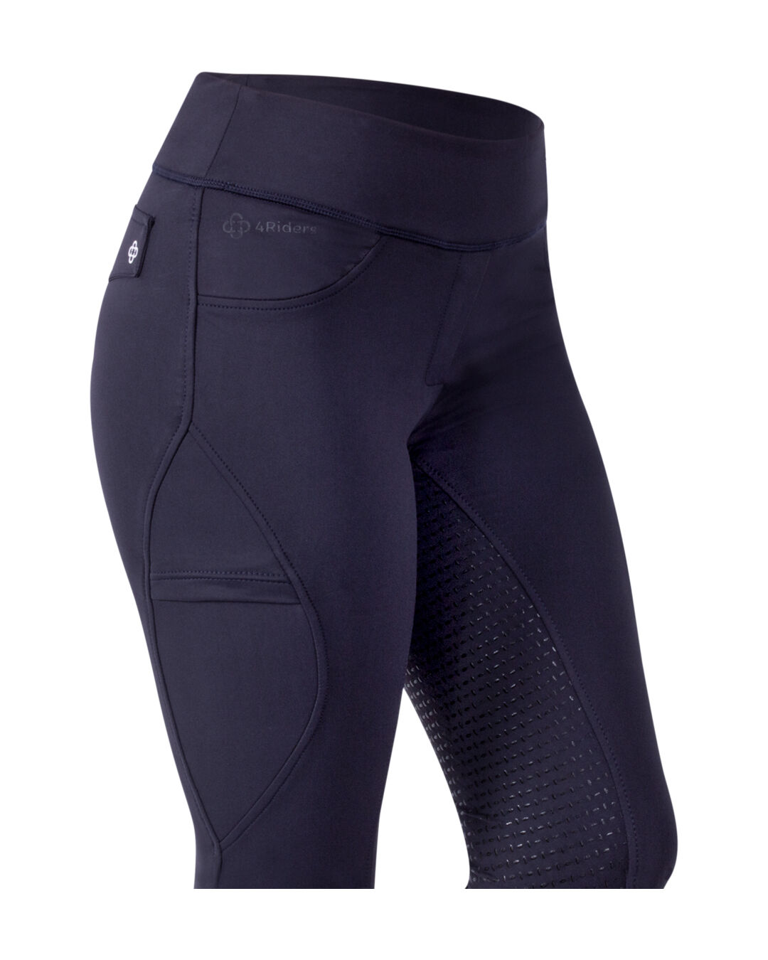 Die 4RIDERS Reitleggings Pisa sieht dank des Zier-Reißverschlusses und der Ziertaschen vorne und am Gesäß aus wie eine klassische Reithose. Dabei bietet sie dir den Komfort und die Bewegungsfreiheit einer Reitlegging. Der breite Bund schmiegt sich deiner Figur perfekt an. Der Vollbesatz-Grip bietet dir einen festen Halt im Sattel. Die Reitleggings verfügt über eine Handytasche am rechten Bein. Zwei glänzende Logo-Prints am Gesäß und am linken Bein runden das sportliche Design ab.