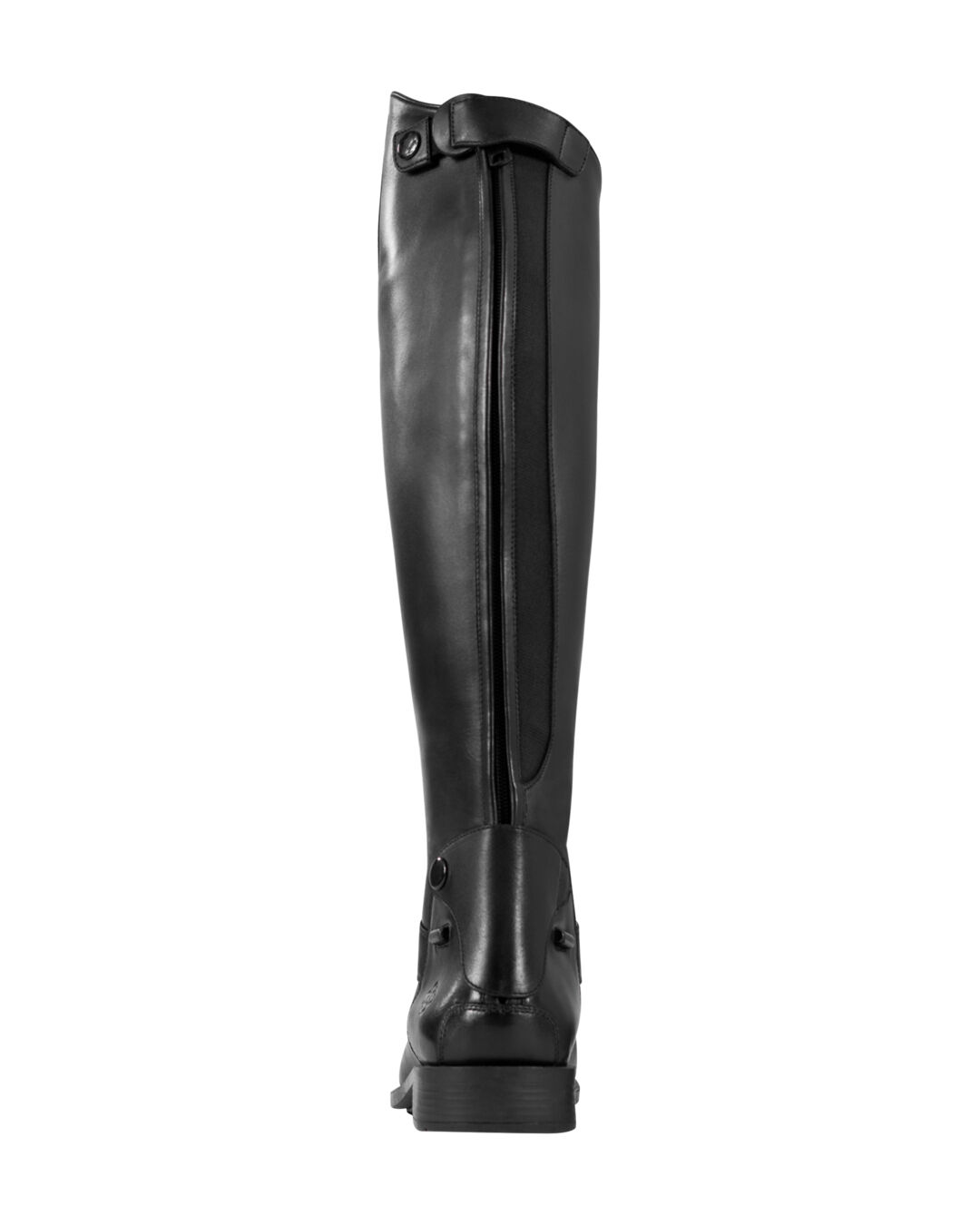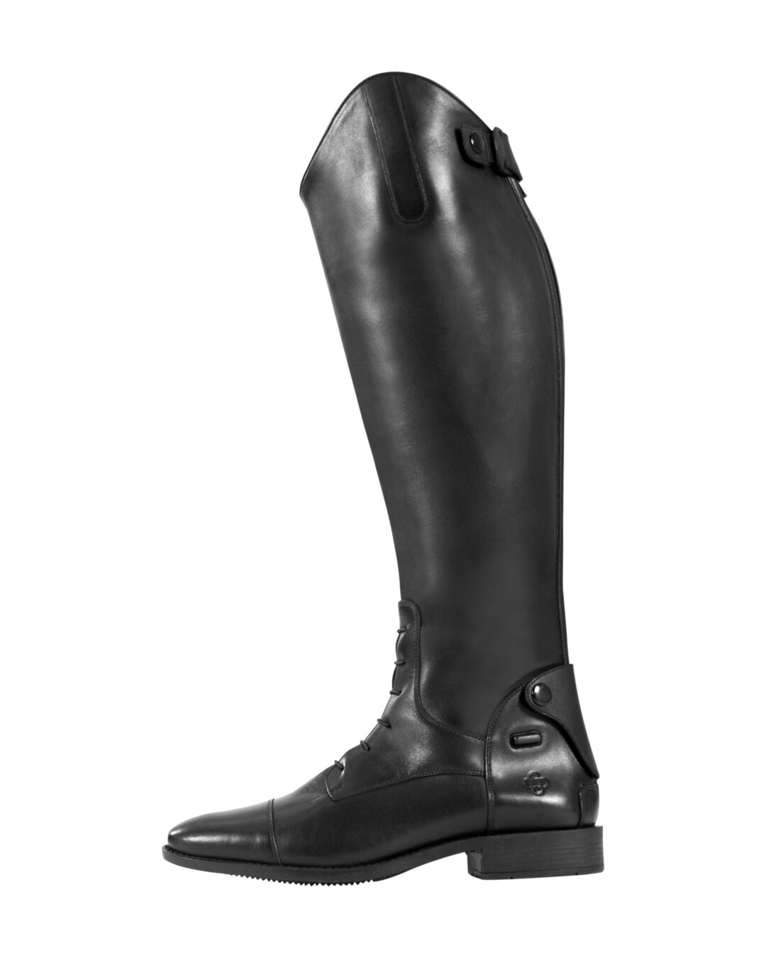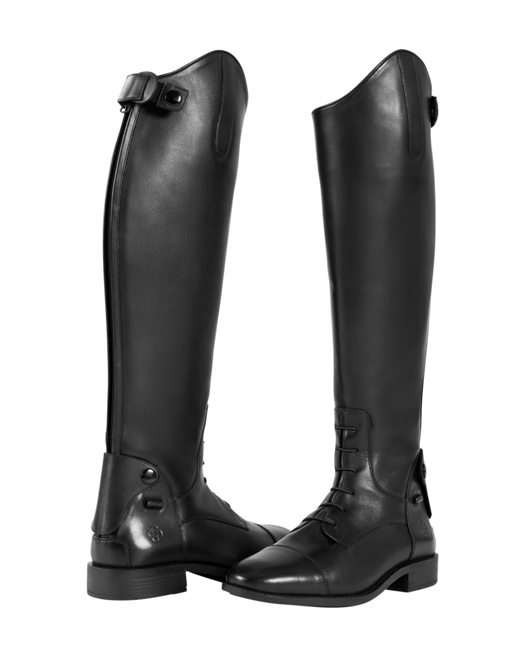 Gefertigt aus einem besonders hochwertigen und formstabilen Leder, bieten diese Stiefel eine exzellente Passform und eine lange Lebensdauer. Die Widerstandsfähigkeit des Obermaterials gegen Schmutz und Nässe macht sie ideal für den Reitsport. Der rückseitige Reißverschluss erleichtert den Einstieg, während der praktische Sporenschutz und die elastische Schnürung vorne sowohl Funktionalität als auch Stil bieten.