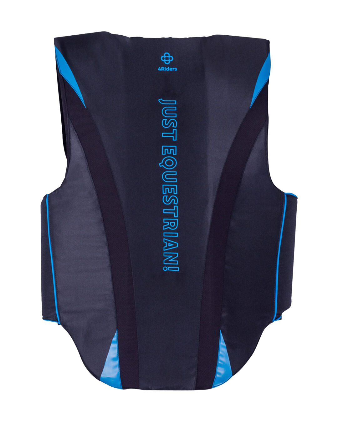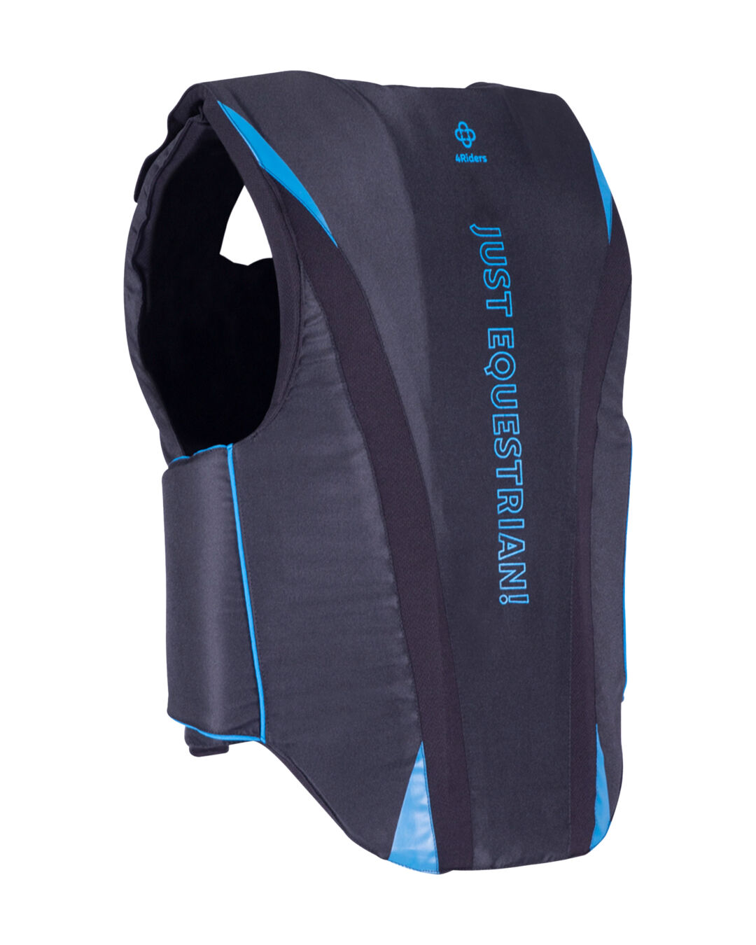 Modische blaue Details entlang der Konturen und der auffällige „Just Equestrian“ Schriftzug auf dem Rücken verleihen der Weste ein sportliches und ansprechendes Aussehen.