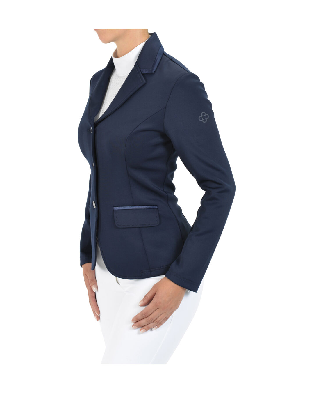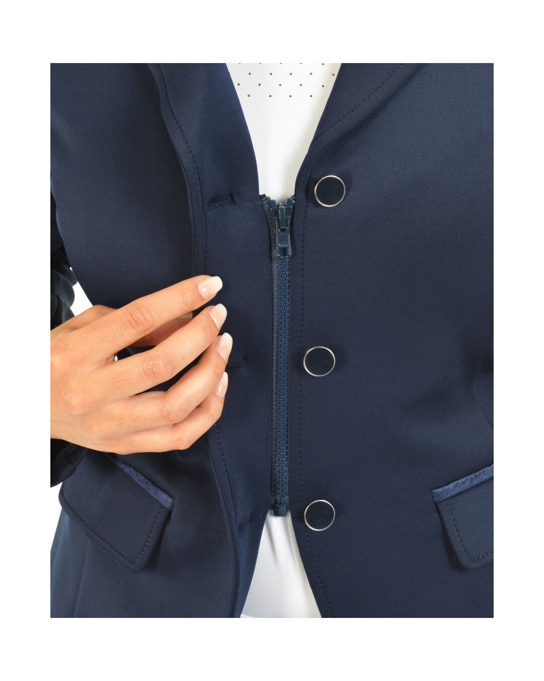 Mit seinem taillierten Schnitt betont das Jacket deine Figur auf dezente Weise und verbindet Funktionalität mit einem schlichten Design. Ob für Turniere oder das tägliche Training – dieses Jacket ist eine stilvolle Wahl für Reiterinnen, die Wert auf Komfort und einen gepflegten Auftritt legen. Die praktische Aufteilung mit einer echten Tasche und einer aufgesetzten Tasche bietet dir zudem Platz für kleine Gegenstände wie Leckerlis, die man gerne schnell zur Hand haben möchte.