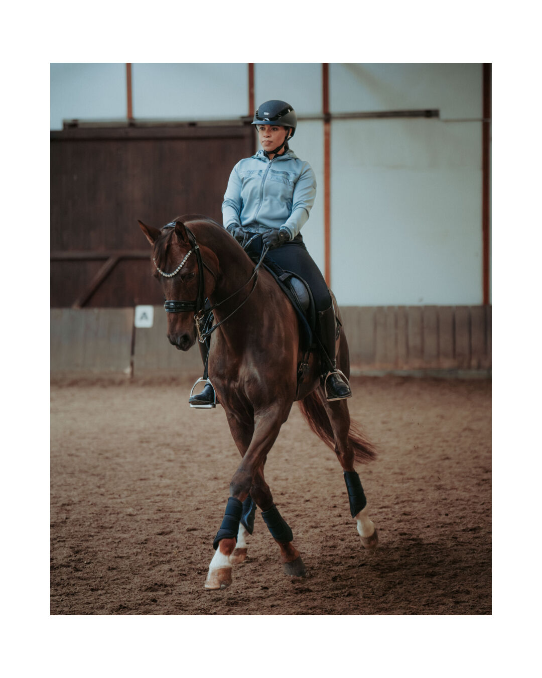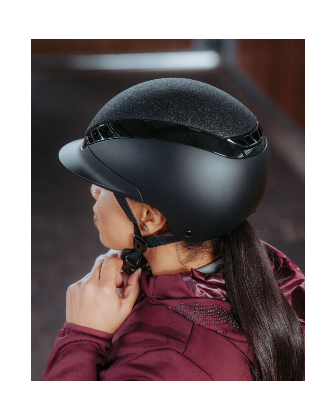 17 Belüftungsöffnungen und clevere Luftkanäle sorgen für ein angenehm frisches Klima – selbst an heißen Tagen. Der Halbring im Inneren passt sich individuell deinem Kopfumfang an und sorgt für einen stabilen Sitz. Ob für Training oder Turnier – dieser Helm ist ein echtes Statement in Sachen Stil und Funktion.