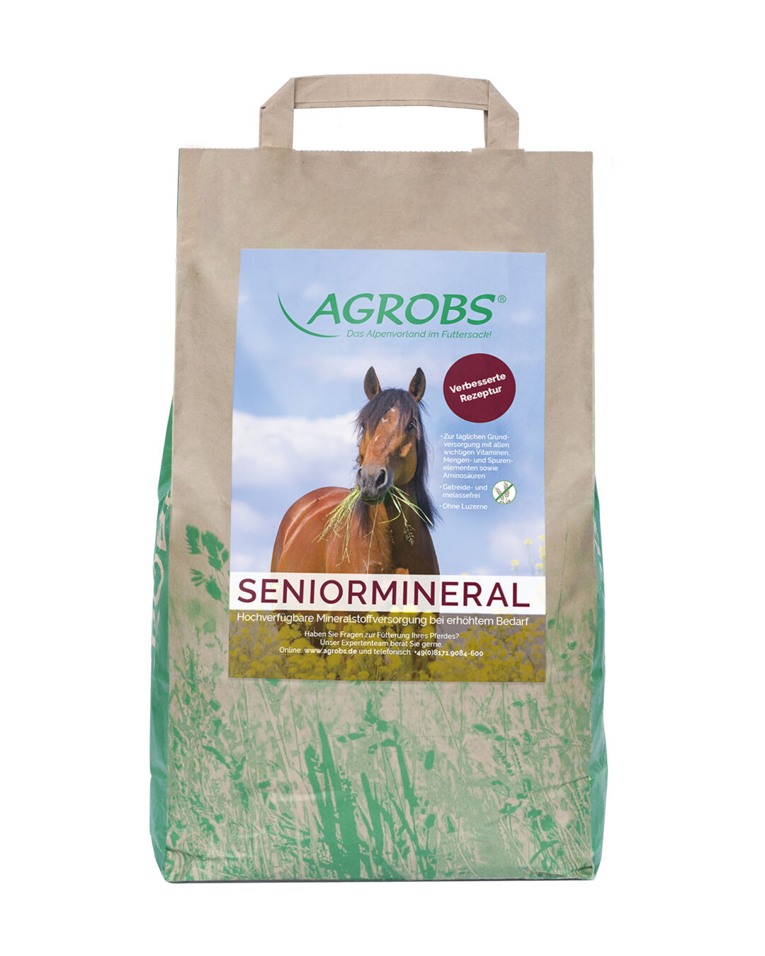 Alte Pferde haben einen anderen Mineralstoffbedarf als ihre jungen Kollegen, weshalb sie eine andere tägliche Fütterung benötigen, um bis ins hohe Alter gesund und vital zu bleiben. Die Rezeptur von Seniormineral basiert auf den bewährten Agrobs Trockengrünfasern. Das Futter enthält keine Melasse oder Getreide und entspricht somit den Bedürfnissen einer artgerechten und hochwertigen Ernährung. Zusätzlich liefert es gut verfügbare Nährstoffe wie Aminosäuren, B-Vitamine und Vitamin C für eine optimale Versorgung der Muskulatur und des Immunsystems. Bierhefe fördert die Verdauung und Öle wie Sonnenblumen- und Leinöl sorgen für ein schönes Haarkleid. Dadurch werden der Körper deines Pferdes auf natürliche Weise mit Vitaminen und essenziellen Fettsäuren versorgt. Obst, Gemüse und Hagebutte runden die Rezeptur ab und leisten einen wertvollen gesunden Beitrag für das Wohlbefinden deines Pferdes.