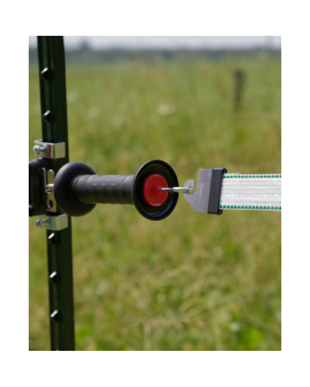 Der Torgriff mit Litzclip Bandanschluss von AKO ist eine hochwertige und praktische Lösung für das einfache Öffnen und Schließen von Weidezauntoren.