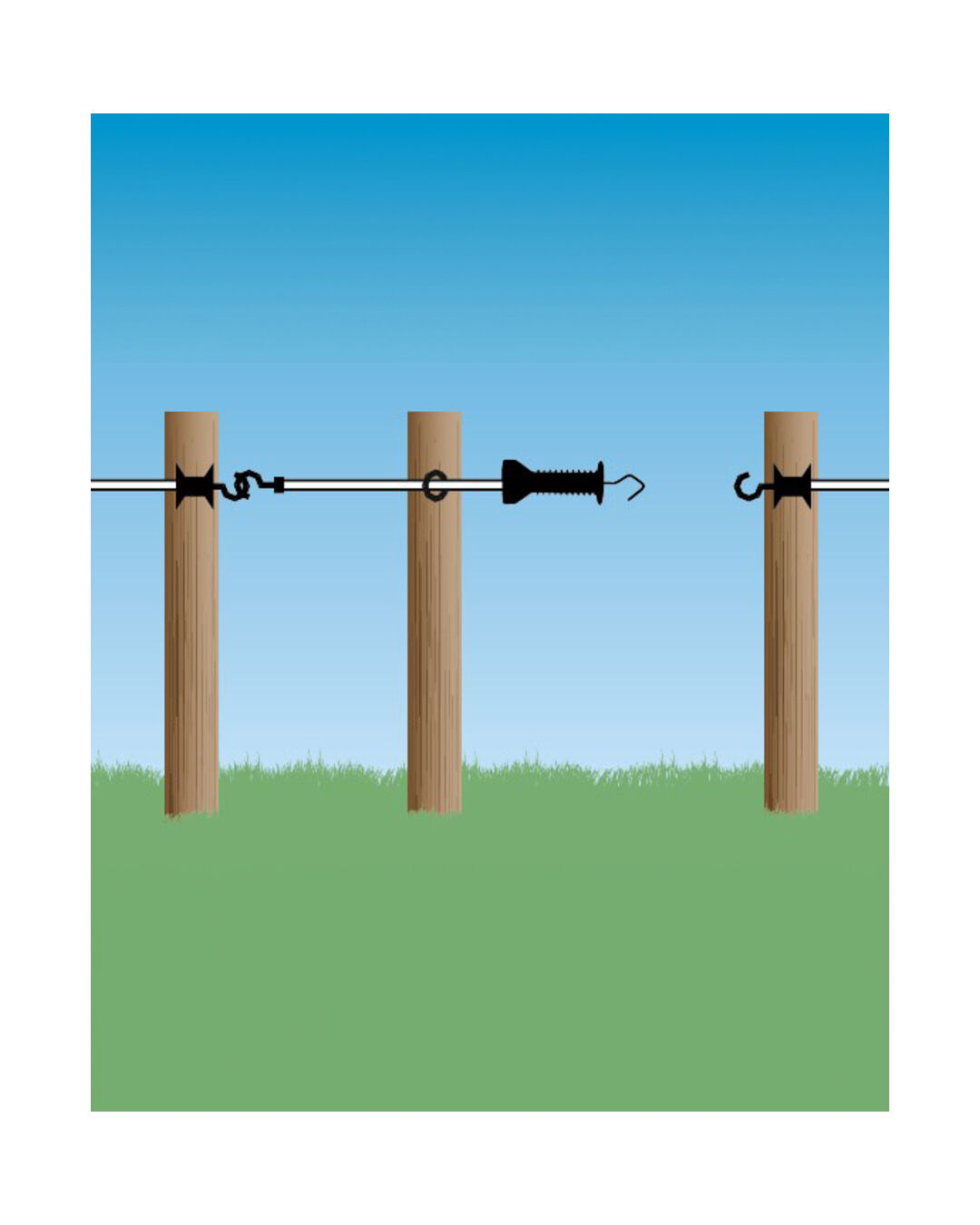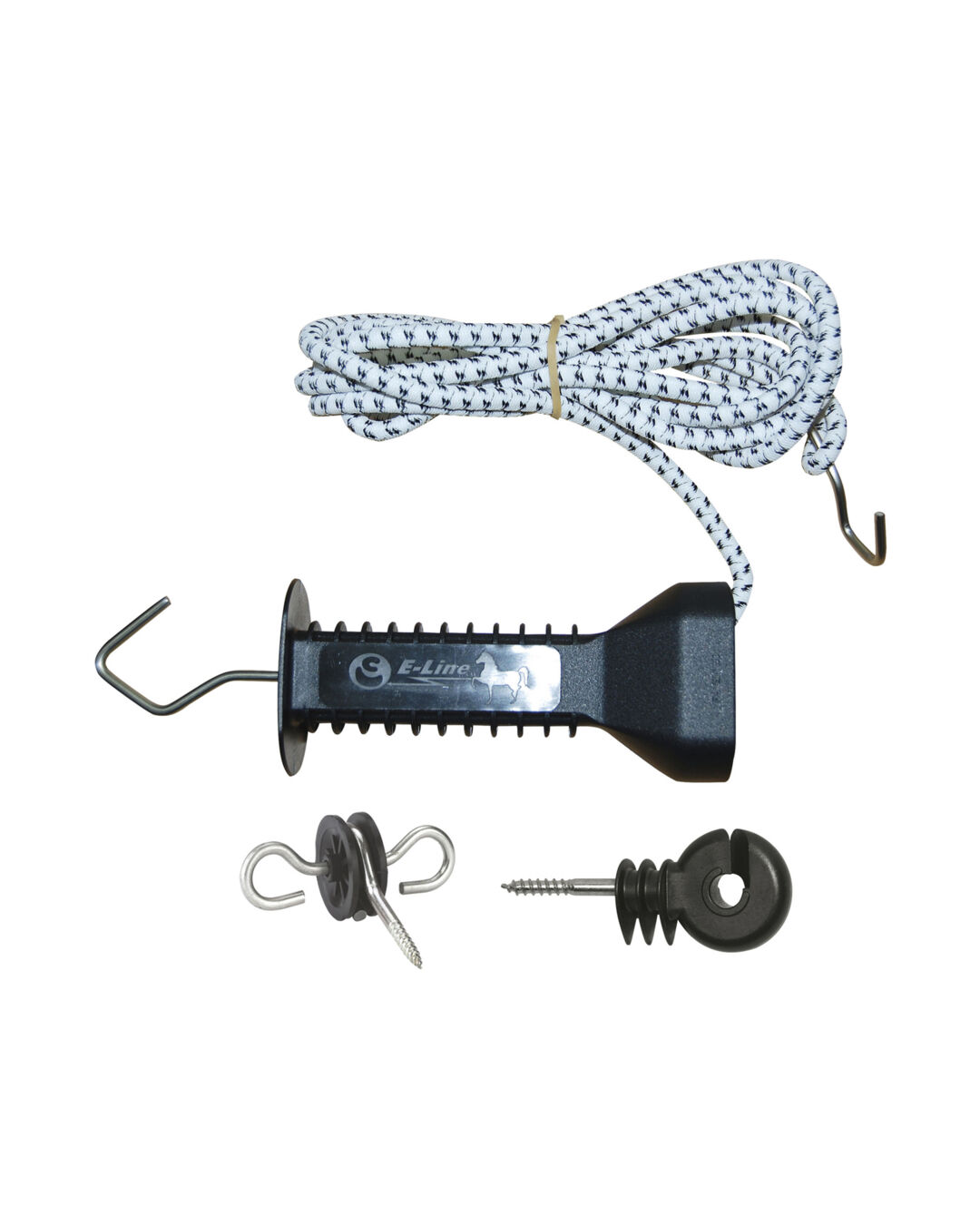 Das Set besteht aus: 1x Ø 7 mm Elastik-Elektroseil (3 Jahre Herstellergarantie) mit 4x 0,25 mm Edelstahlleiter, mit Verbindungshaken, 1x robuster Torgriff, 1x Ringisolator, 1x Torisolator.