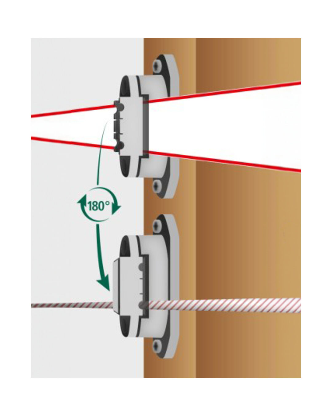 Die Innovation setzt sich fort in der Möglichkeit, das obere Klemmelement um 180 Grad zu drehen, wodurch eine noch sichere Fixierung für Weidezaunseile und -litzen erreicht wird. Dies macht den Isolator zu einem universellen Helfer für Anfangs-, Eck- und Streckenmontagen und erlaubt ein einfaches Nachspannen aller Leitermaterialien.