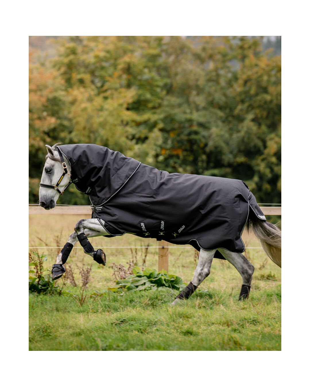 Mit dem Horseware Liner-System kompatibel, um bei wechselnden Klima- und Wetterbedingungen den Wärmegrad der Decke zu erhöhen. Ein abnehmbares Halsteil bietet Vielseitigkeit. Der V-Frontverschluss und der Surefit-Halsausschnitt eliminieren den Druck auf die Schulter, sodass Scheuerstellen vermieden werden. Dies bietet auch mehr Komfort im Halsbereich des Pferdes beim Grasen. Drei Kreuzgurte sorgen für einen sicheren Sitz. Die doppelten Beinausschnitte bieten Bewegungsfreiheit und maximale Bauchabdeckung. Reflektorstreifen sorgen für Sicherheit. Ein Schweifriemen hält die Decke an Ort und Stelle.