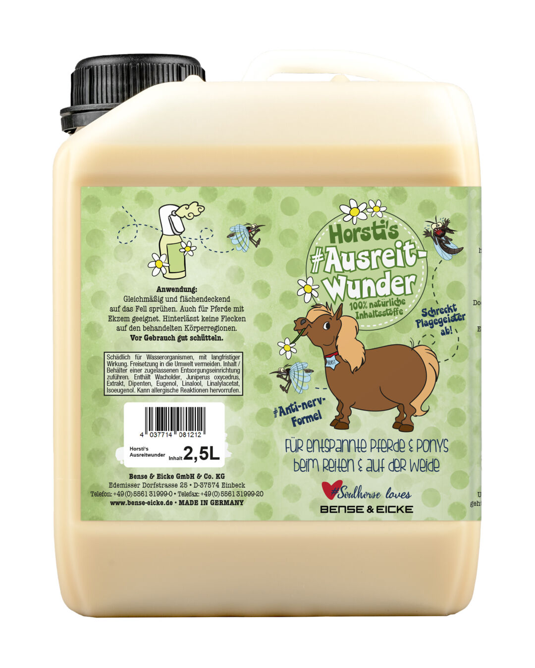 Horstis Ausreitwunder von Bense & Eicke ist das perfekte Deo für Pferde, das endlich Abhilfe gegen lästige Plagegeister auf der Weide schafft. Mit dem natürlichen Duft von Walnussöl und Orange ist es nicht nur angenehm für Pferd und Reiter, sondern auch äußerst effektiv. Das Spray hält auf der Weide und im Stall eine ganze Weile und pflegt das Ponyfell noch dazu. So wird der Weidegang zu einer Wellnesstour und dein Pony kann endlich in Ruhe grasen. Bei vermehrter Bewegung und Schweißbildung hält das Spray jedoch nicht ganz so lange. Auch bei Juckeponys mit Ekzem kann das Spray verwendet werden, um Linderung zu verschaffen.