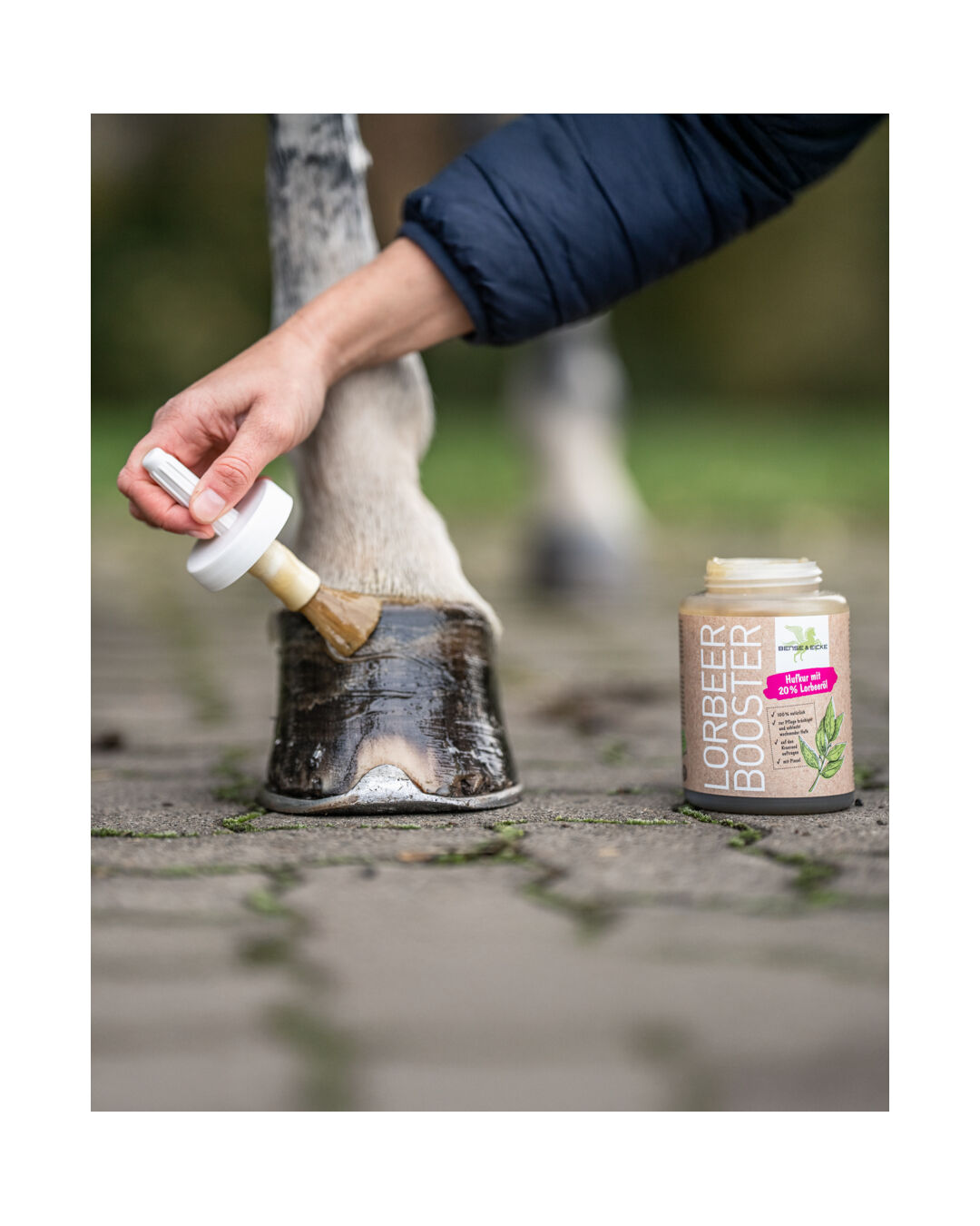 Mit einem Anteil von 20 % reinem Lorbeeröl unterstützt es die Elastizität des Hufhorns, hält die Struktur stabil und bewahrt gleichzeitig den natürlichen Wasserhaushalt. Trockene oder rissige Hufe gehören damit der Vergangenheit an, denn die feuchtigkeitsspendende Formel dringt tief ein und sorgt für ein gesundes Hufbild.