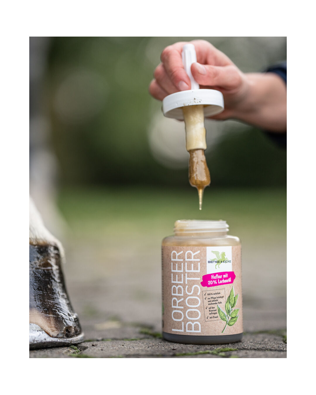 Das Lorbeer Booster Huföl von Bense & Eicke ist die Extraportion Pflege für die Hufe deines Pferdes – komplett natürlich und vollgepackt mit der Kraft von Lorbeeröl.