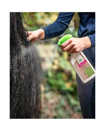 Aber das ist noch nicht alles: StarFinish wirkt wie ein unsichtbarer Schutzschild gegen Staub und Schmutz. Egal ob nach dem Reiten, auf der Koppel oder im Stall – das Fell bleibt für mehrere Tage deutlich sauberer. Ein echter Gamechanger, wenn du weniger putzen und mehr reiten willst.