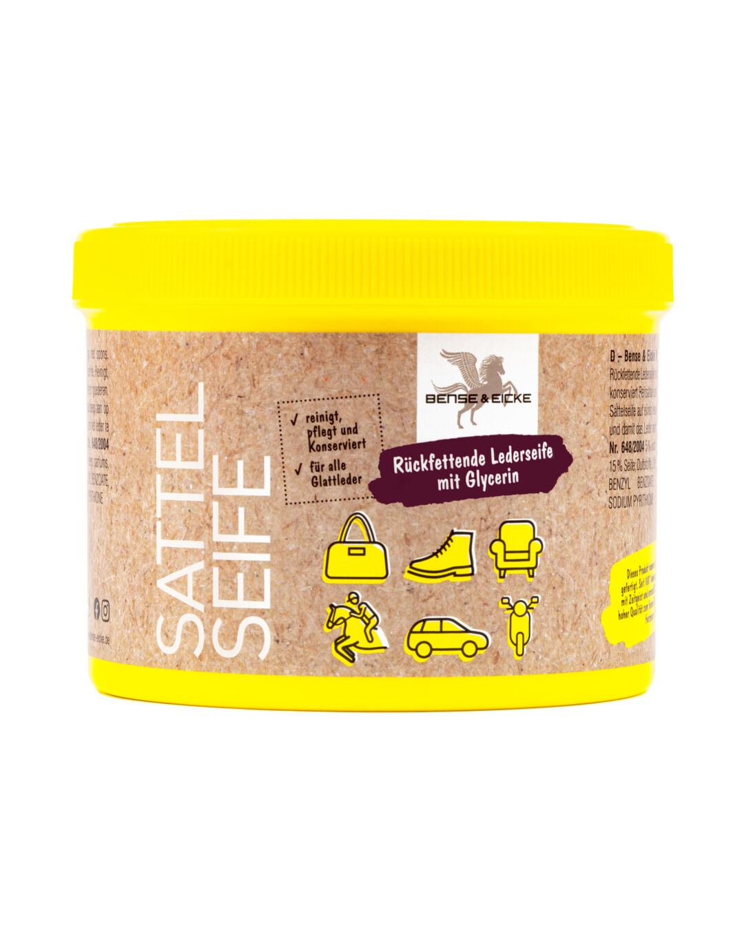 Die Sattelseife von Bense & Eicke dient der Pflege von Lederzeug aller Art. Es wirkt rückfettend, reinigt, pfelgt und konserviert.