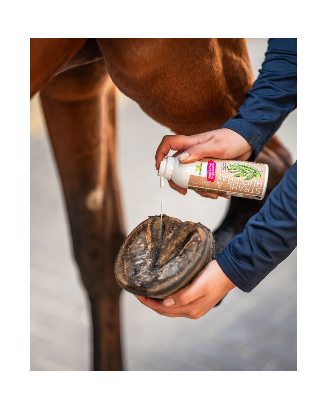 | Anwendungshinweis: | Nach gründlicher Reinigung, Hufstrahl und Hufsohle einsprühen. Kurz antrocknen lassen. Bei Bedarf tägliche Anwendung. Sonst ein- bis zweimal wöchentlich anwenden. |