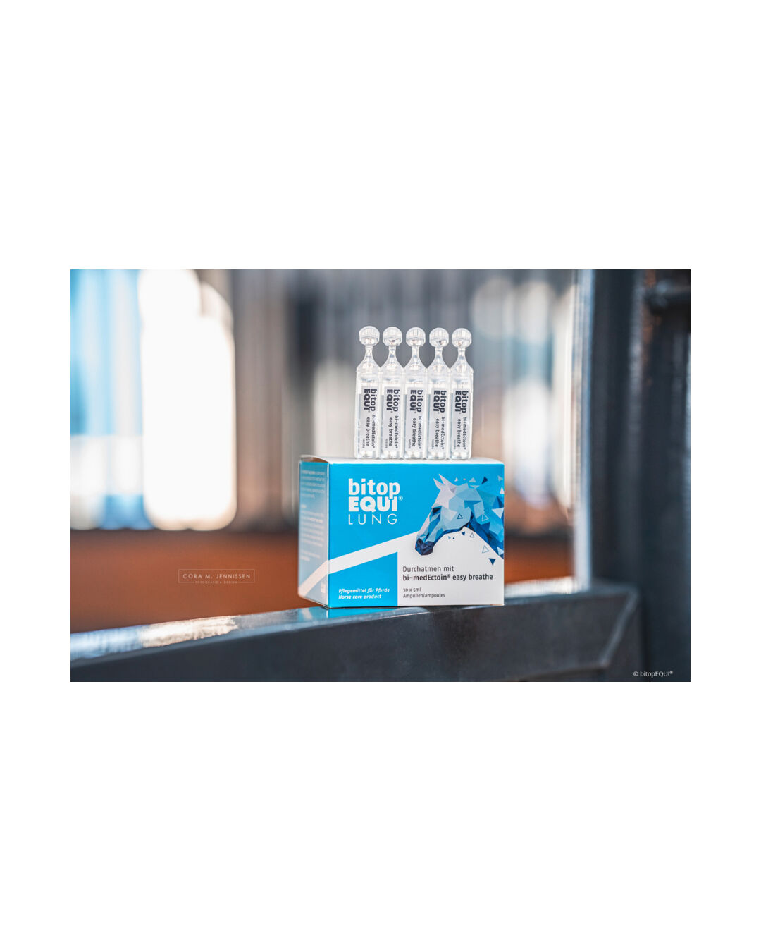 Staub, Pilzsporen und Pollen können Reizungen der Lunge auslösen und zu chronischen Atemwegserkrankungen führen. Die sterile Lösung bi-medEctoin easy breathe der Marke bitopEQUI kann hier Abhilfe leisten.