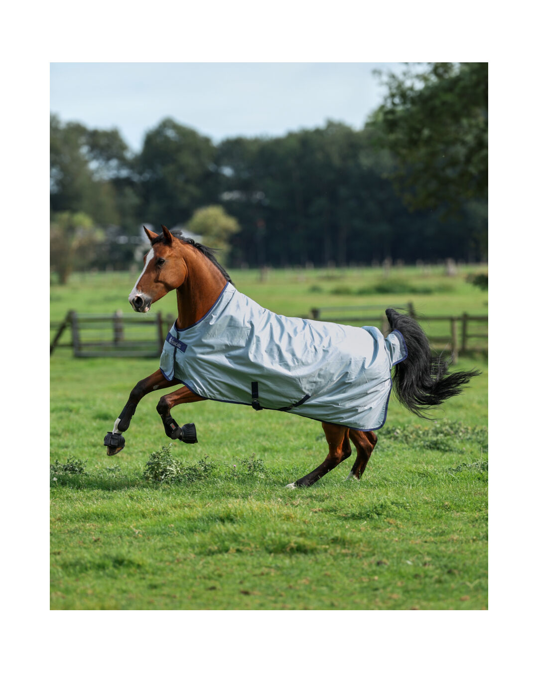 Die Decke ist mit einem „Click’n Go“ System mit „Magnetic-Snap-lock“ Verschluss ausgestattet, der eine einfache Handhabung gewährleistet. Schulterfalten sorgen für eine optimale Bewegungsfreiheit, während Kreuzgurte, Beingurte und der Schweiflatz für einen sicheren Sitz sorgen. Reflektorstreifen an Brustverschluss und Schweiflatz erhöhen die Sichtbarkeit und Sicherheit.
