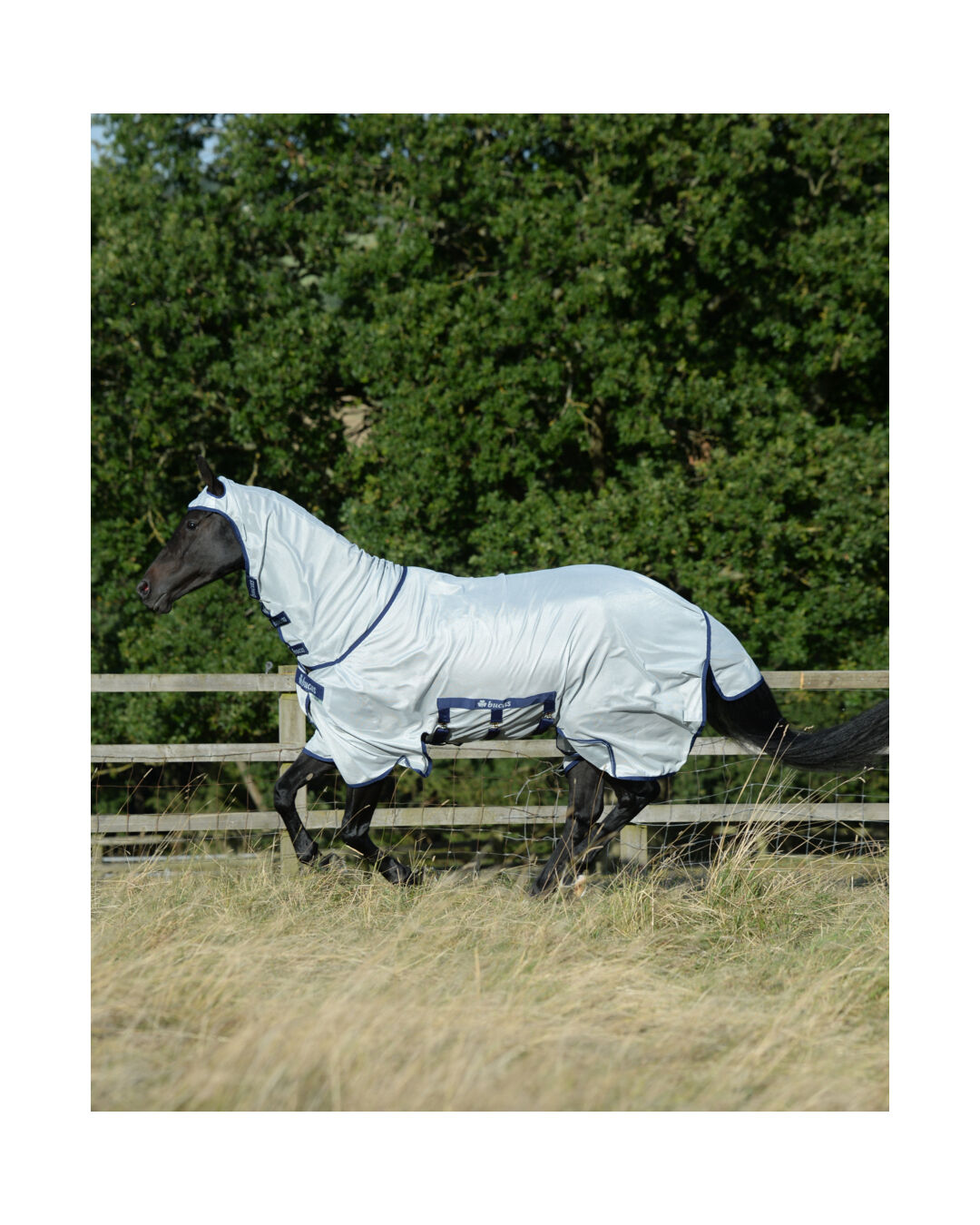 Das Herzstück dieser Fliegendecke ist das besonders feinmaschige, leichte Netzgewebe, das Fliegen effektiv abhält und gleichzeitig das Fell deines Pferdes vor dem Ausbleichen durch die Sonne schützt. Ein besonderes Merkmal der Buzz-Off X-Fliegendecke ist der umfassende Bauchschutz: Die Decke umschließt den gesamten Bauchbereich und wird mit einem Bauchlatz gesichert, der mit drei Gurten befestigt wird. Dieser Schutzmechanismus gewährleistet, dass selbst die empfindlichsten Bereiche vor Fliegen und Insekten sicher sind.