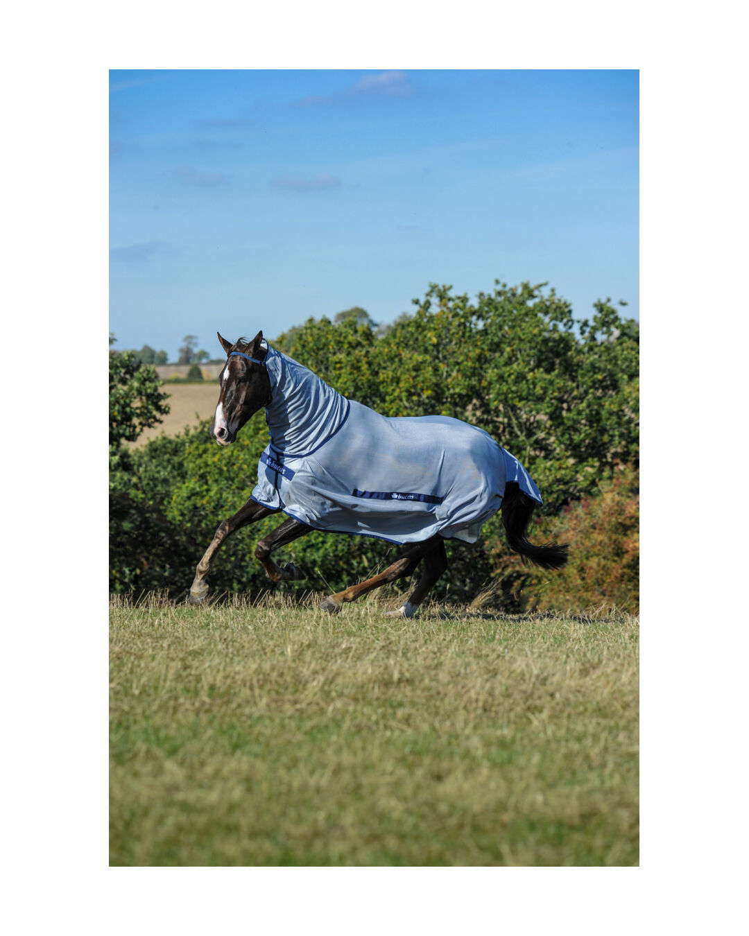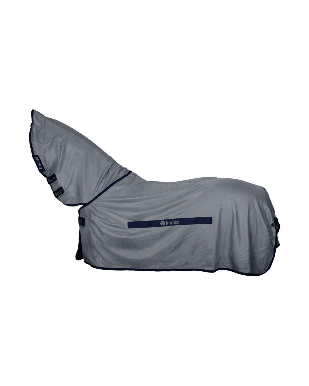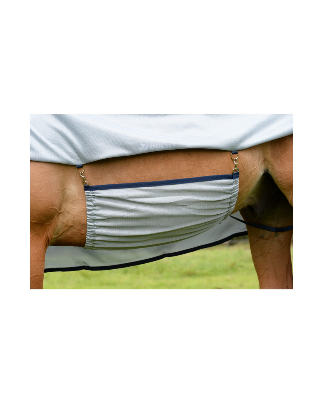 Diese Fliegendecke blockiert außerdem mehr als 75 % der UV-Strahlen und verfügt über eine sonnenreflektierende Außenseite, die dein Pferd auch bei heißem Wetter angenehm kühl hält. Die Decke zeichnet sich durch Schulterabnäher aus, die eine maßgeschneiderte Passform im Brust- und Schulterbereich ermöglichen. Diese Abnäher sind ein charakteristisches Designmerkmal von Bucas. Verfügbar auch in kleineren Größen für Ponys, bietet diese Fliegendecke einen effektiven Insektenschutz.